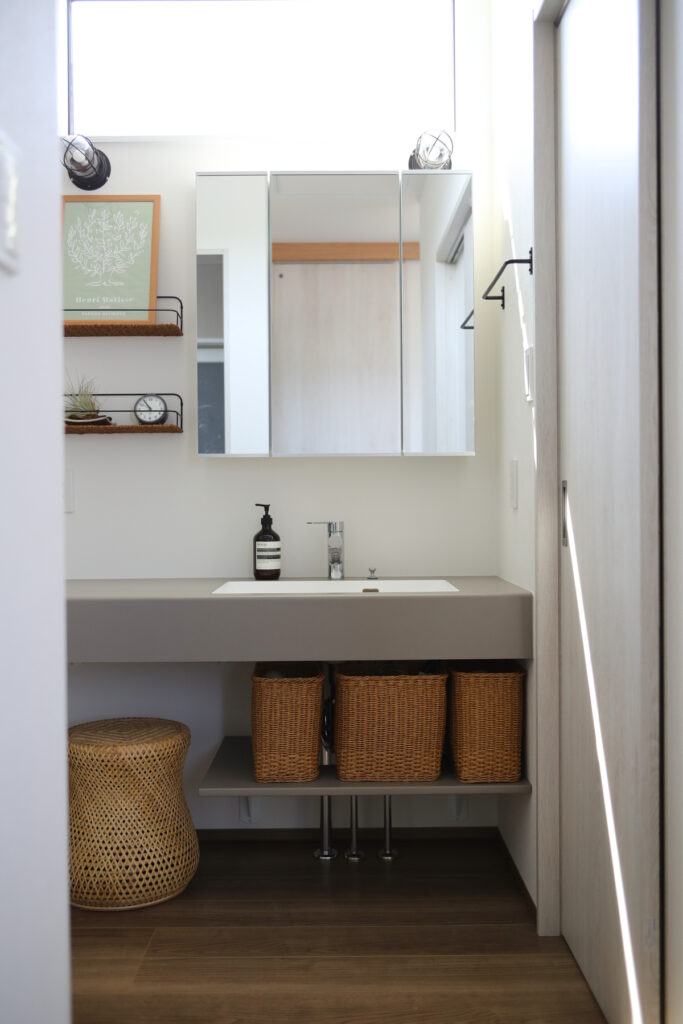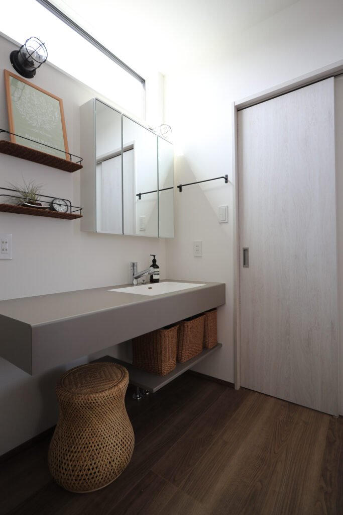 浴室・洗面・ランドリールームを東側にひとまとめにした間取りは、日々の家事をスムーズに運ぶ工夫のひとつです。シンクと一体型の洗面台もグレーでそろえ、空間の統一感を保ちながら収納を充実させました。バルコニーへの動線も自然につながり、晴れた日には外でランチを楽しめる余白も生まれました。