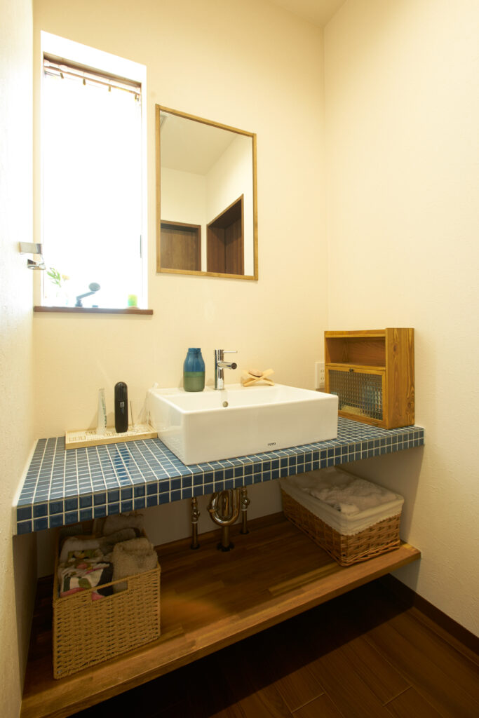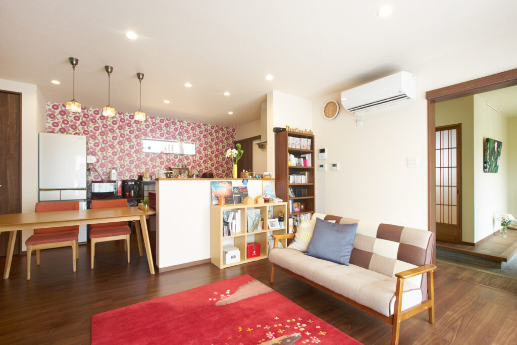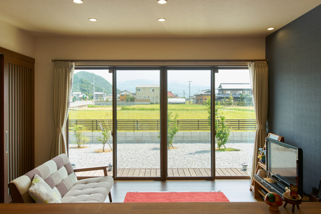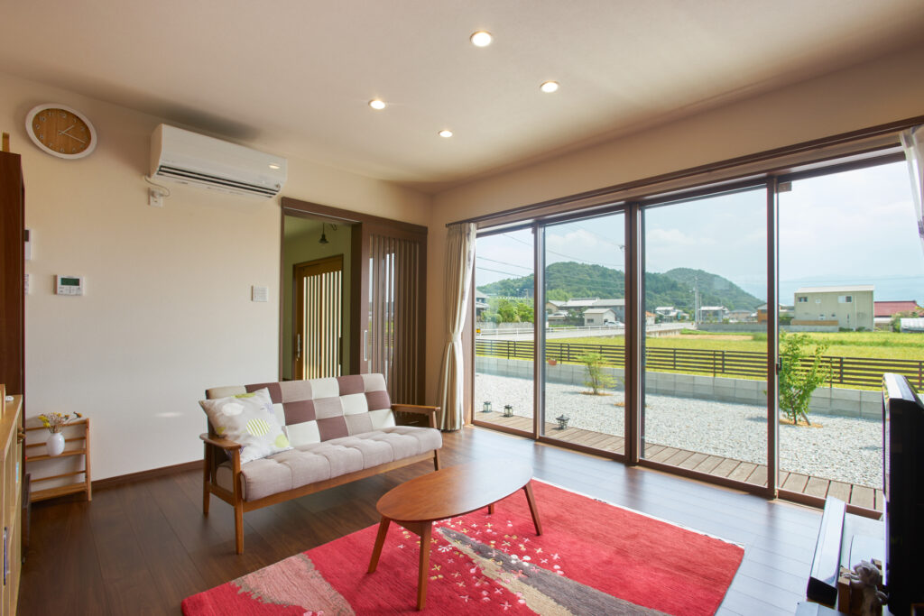 リビングから正面に讃岐山脈を望み、庭には紅葉、梅、ミモザが季節ごとに彩りを添えます。縁側はリビングから寝室までひと続きになっており、風が室内をやわらかく通り抜けます。休日には家庭菜園やDIYに没頭するふたりにとって、この平屋は「今日は何からやろう」と胸が弾み、尽きない楽しみが満ちる場所です。