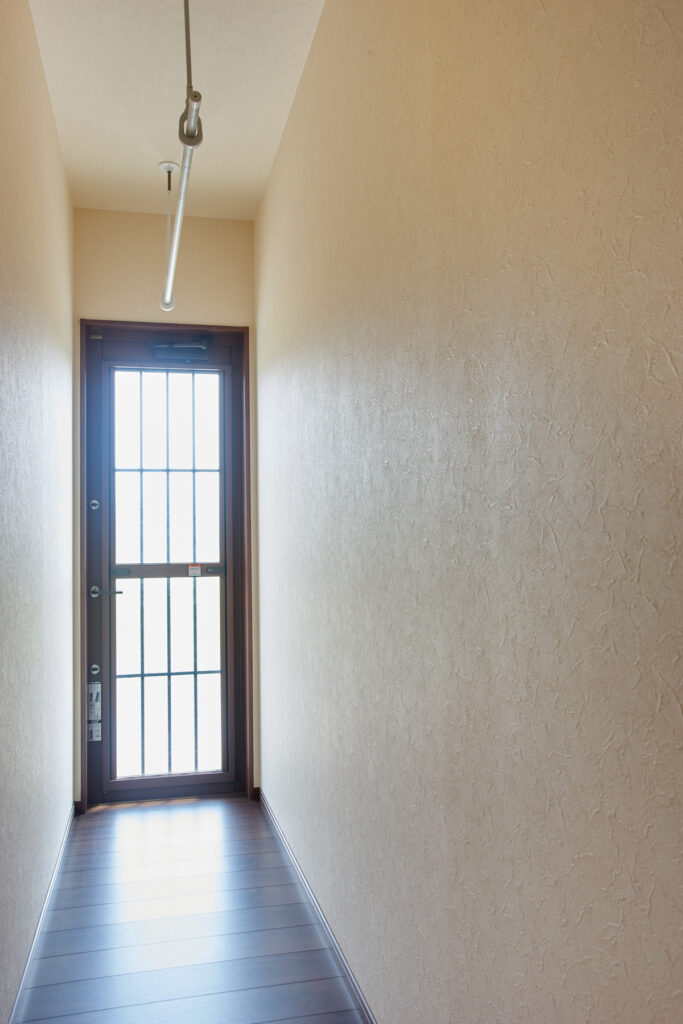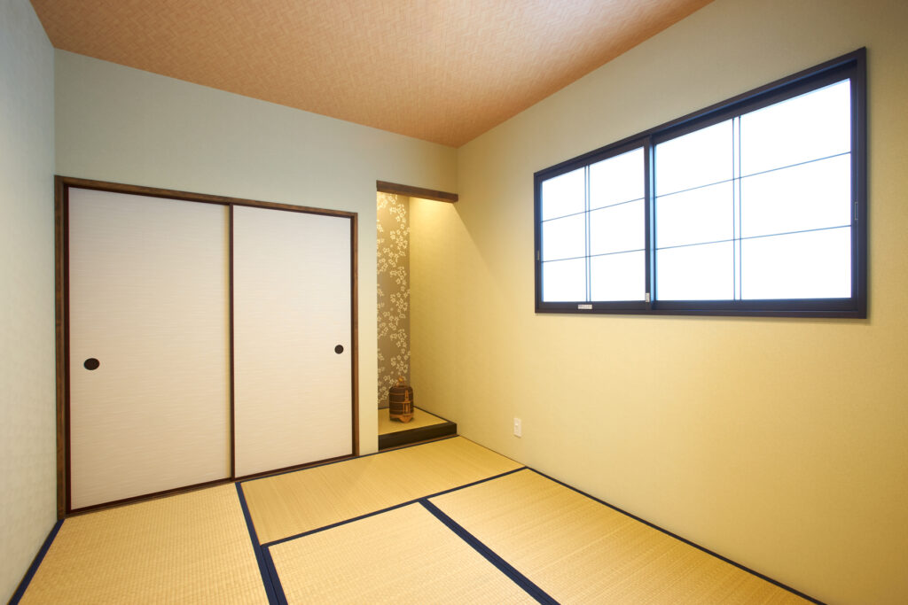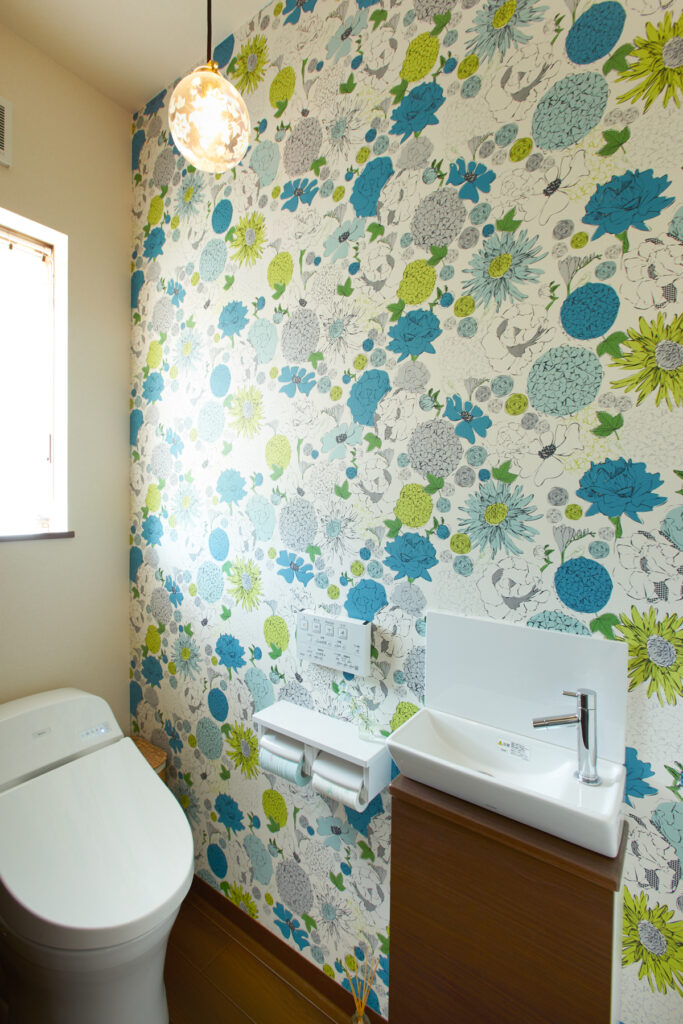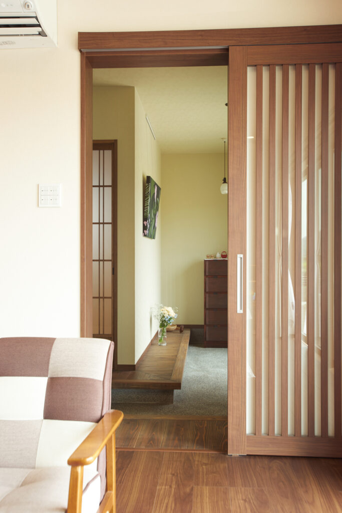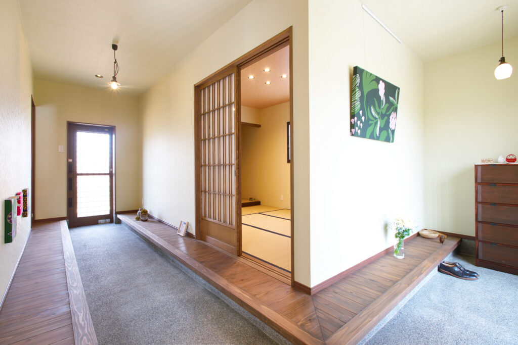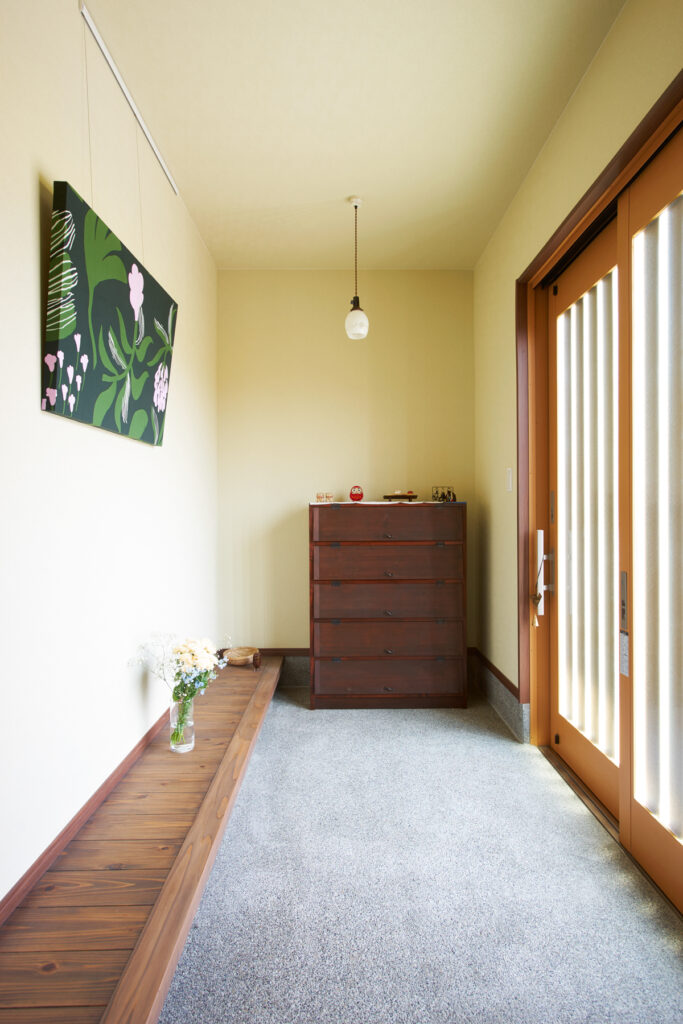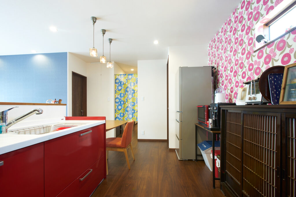 着物を愛する奥さまが熱望した和室には、床の間が設けられ、大切な着物を守る桐だんすも収まります。玄関から北側の勝手口まで続く土間は、和風の引き戸と相まってノスタルジックな趣を醸し出します。鮮やかな花柄の壁紙や骨董品を再生した食器棚・照明など、奥さまの審美眼が随所に宿る室内が生まれています。