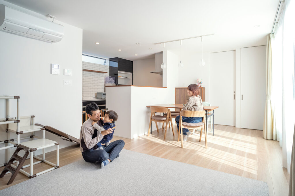 家族それぞれが心地よい距離感で自分たちの時間を慈しめるように、空間には余白が設けられています。お子さまが伸び伸びと駆け抜ける足音と、中庭が描く四季折々のスケッチ。室内にはあたたかい光が差し込み、絶えず家族の笑顔が溢れています。「黒石建設」と何度も打ち合わせを重ねてつくり上げたこの住まいは、Tさん家族の確かな日常を静かに、そして深く支え続けています。
