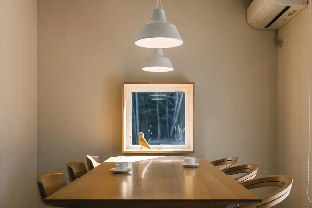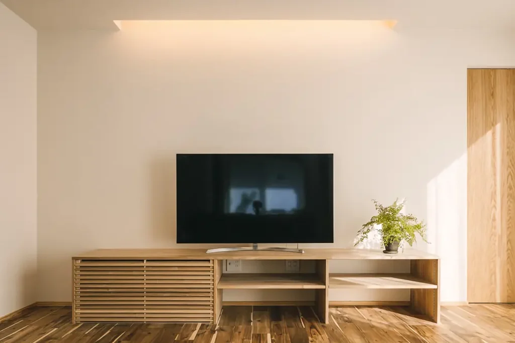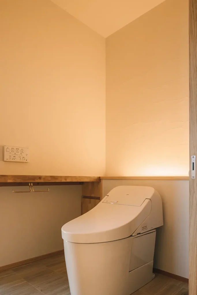 「広い土地を生かして借景を楽しめるようにしたい」という施主の要望から、南側に広がる林の景色を最大限に生かした住まいです。窓や家具の配置を工夫して、リビングなどくつろぎの空間から常に緑を眺められるように設計。絵画のように切り取られた美しい風景が、毎日の暮らしを豊かに彩ります。