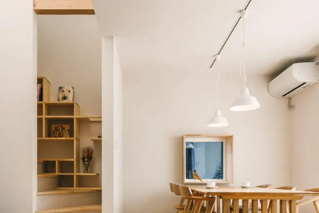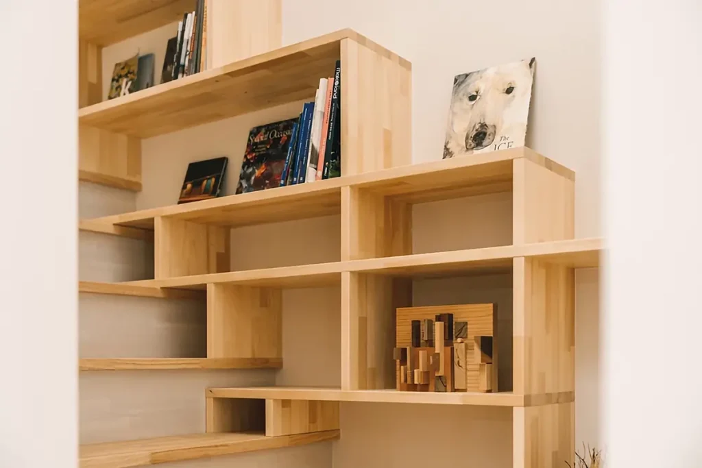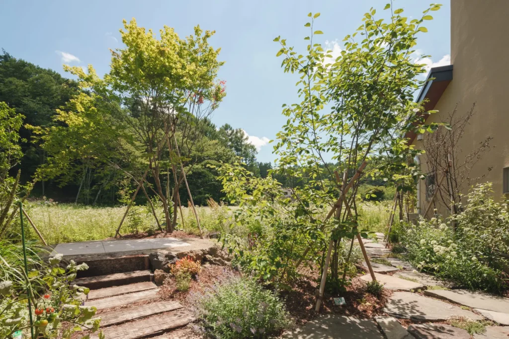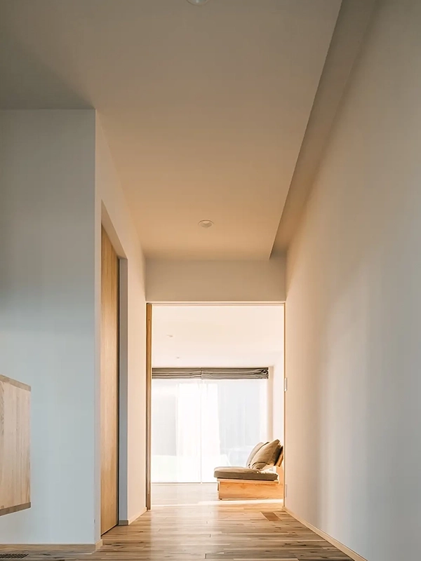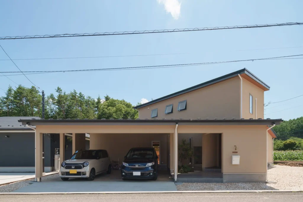 雨や雪の日でも濡れずに家の中に入れるインナーガレージが便利です。庭は周囲の環境と調和し、家の中と外で景色を楽しめるようになっています。階段のデッドスペースを生かした本棚、落ち着いた雰囲気を演出する間接照明の廊下など、暮らしをより快適にする工夫が随所に施されています。