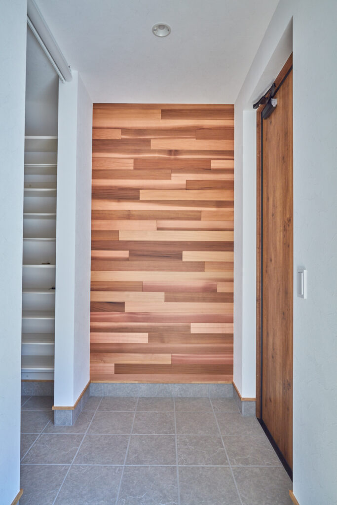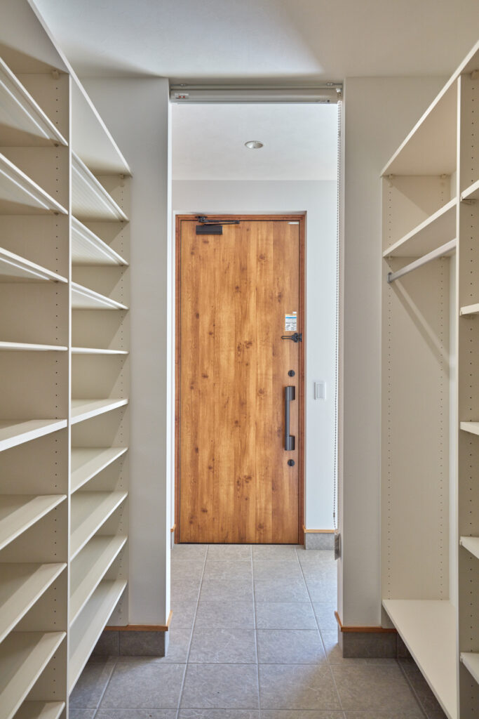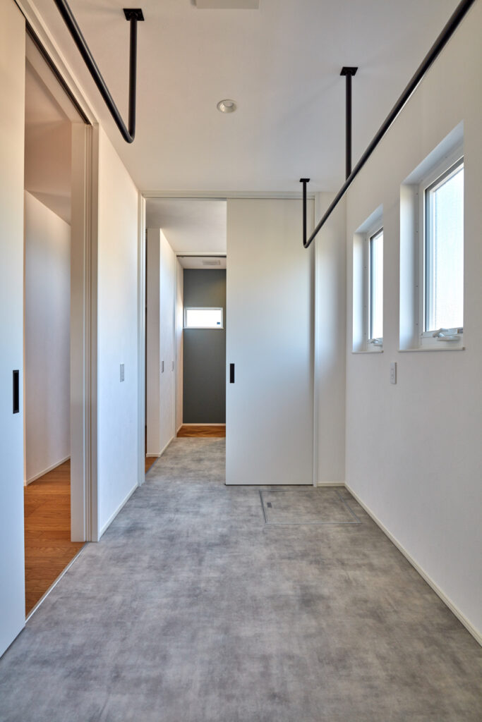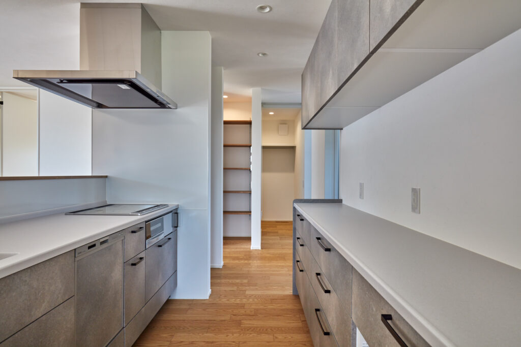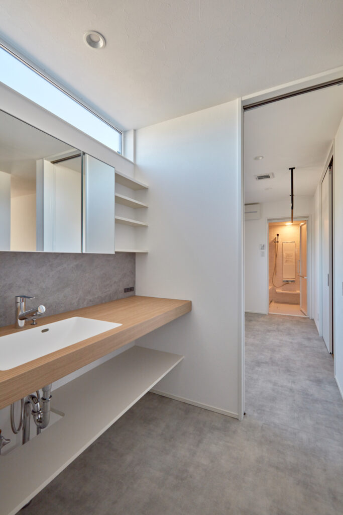 キッチンとサニタリーが並行する水回りは、家事の流れをスムーズにします。洗濯物を室内干しした後、洗面とキッチンの間に設けた収納へそのまま片付けられる工夫が、忙しい時間にも心の余裕をもたらします。キッチンから家じゅうを見渡せるため、夕食準備の最中でも、遊びに来た子どもたちをあたたかく迎え入れることができます。