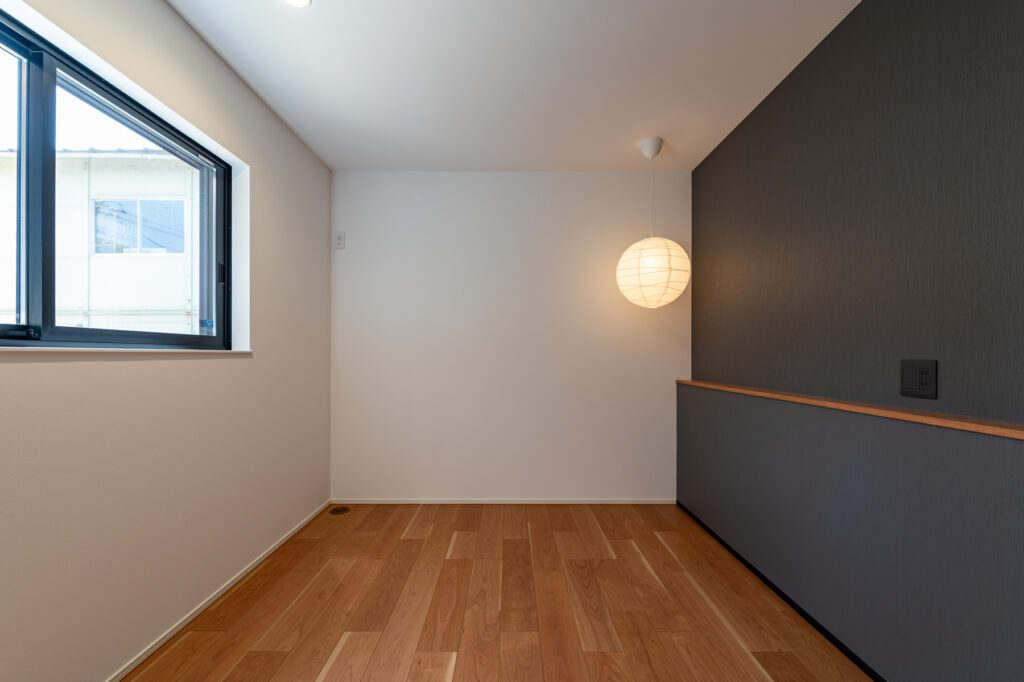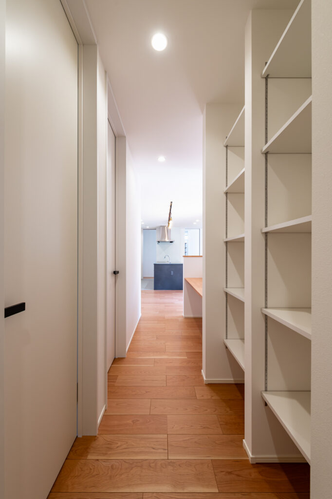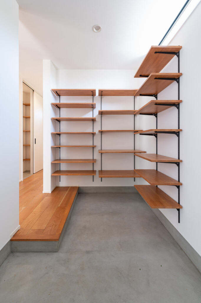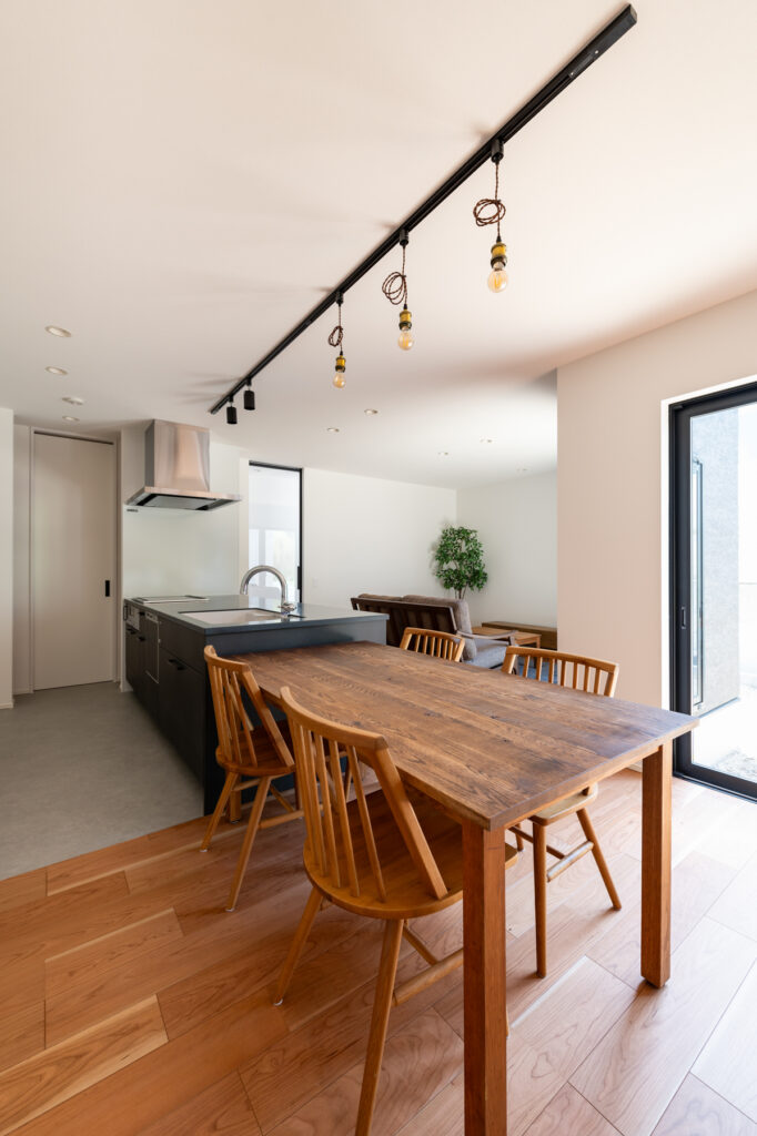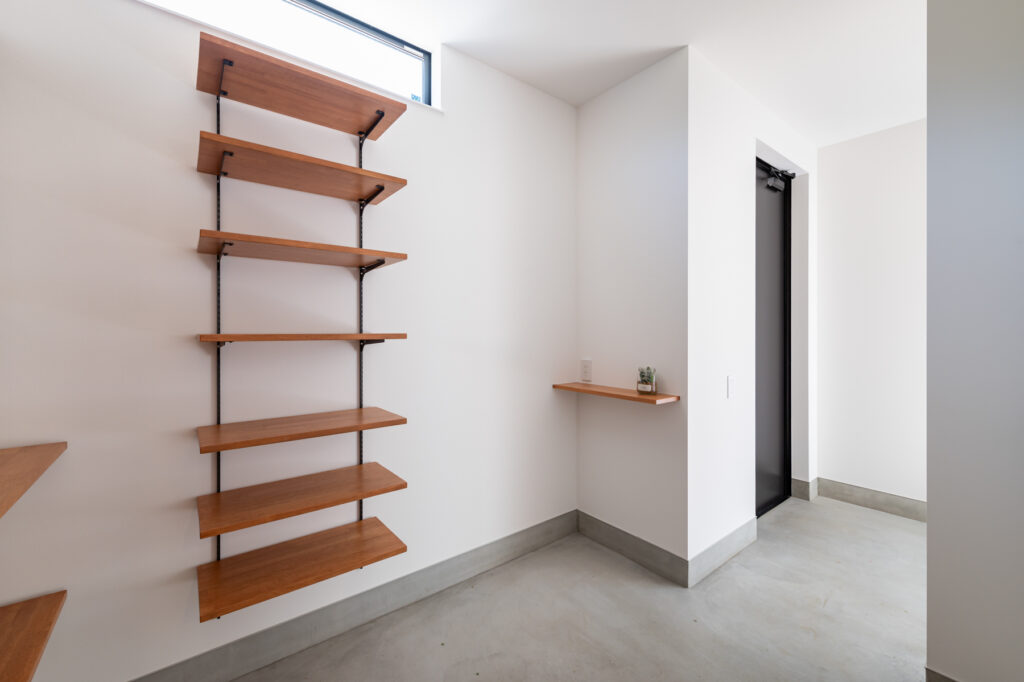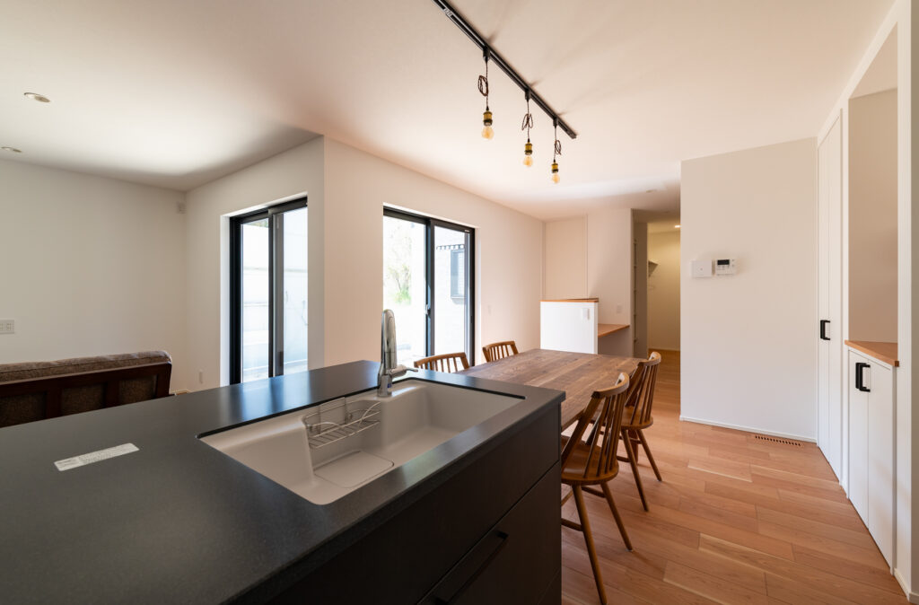 白を基調とした室内に、黒で引き締めたキッチンが映えます。収納力を確保しながらも見た目はすっきりと整い、暮らしやすさを支えています。美容師である奥さまの希望で設けた土間スペースは、家族だけの小さなサロンとして活躍。将来的な使い方まで見据えた設計が、ふたりのセンスを反映しています。カーテンを必要としない窓の配置が、外の景色を室内に招き入れます。