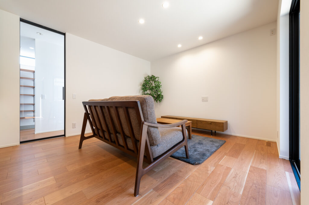 大きな窓を開ければ、そのままテラスへ。室内と屋外の境界が曖昧になり、季節の移ろいを身近に感じられます。中庭を眺めながら過ごす時間は、家族に穏やかな余白をもたらします。子どもが遊ぶ姿を見守りながら、夫婦で語らう夕暮れ。平屋ならではの一体感が、家族それぞれの居場所を静かに包み込み、笑顔あふれる日々を育んでいきます。