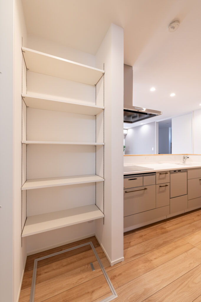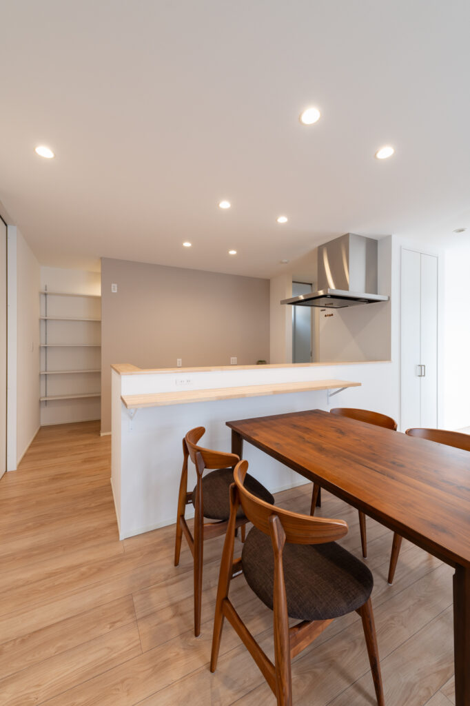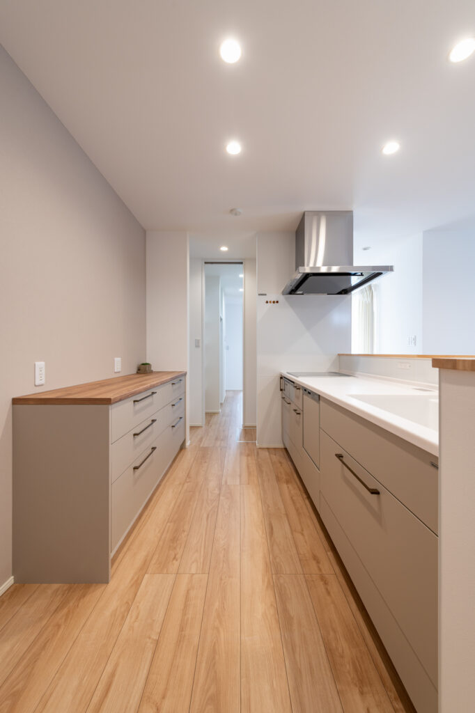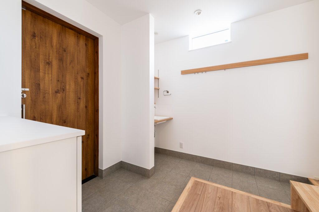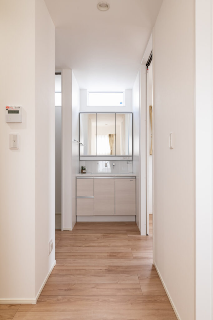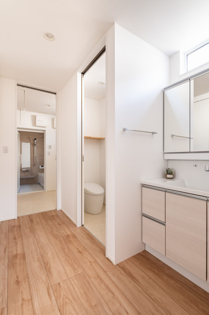 キッチンから洗面室、浴室へと一直線につながる設計により、料理や洗濯といった日々の作業がスムーズに進みます。キッチンには調理スペースと作業カウンターを分けて配置し、複数人でも動きやすい工夫を凝らしました。玄関には造作の収納と手洗いスペースを設け、帰宅後すぐに手を洗える仕組みです。暮らしの中で自然と整う仕掛けが、家族の時間を豊かに育てます。