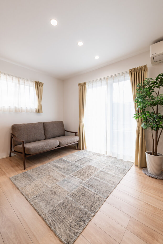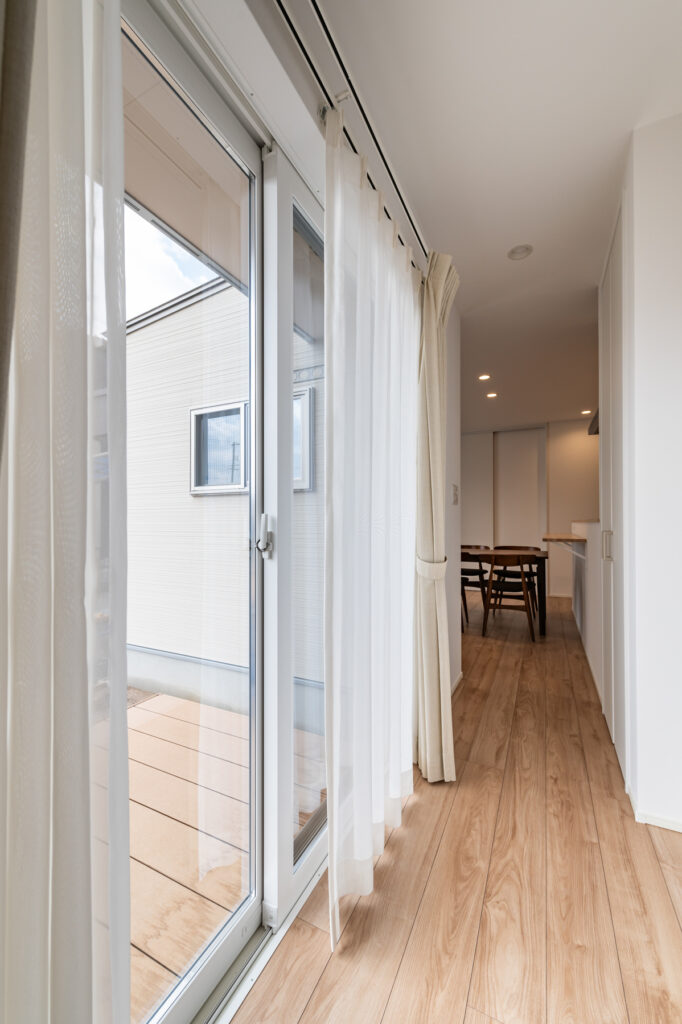 夏はエアコン一台で涼しく、冬は暖房を消しても冷え込まない室内が、一年を通して家族を守ります。廊下に面した大きな窓からは、ウッドデッキへと視線が抜け、外の景色を身近に感じられます。季節ごとに変わる光の表情や、庭の緑の成長を楽しみながら、家族の笑顔が自然と増えていく住まいです。健康に配慮した空気環境が、毎日を特別なものに変えていきます。