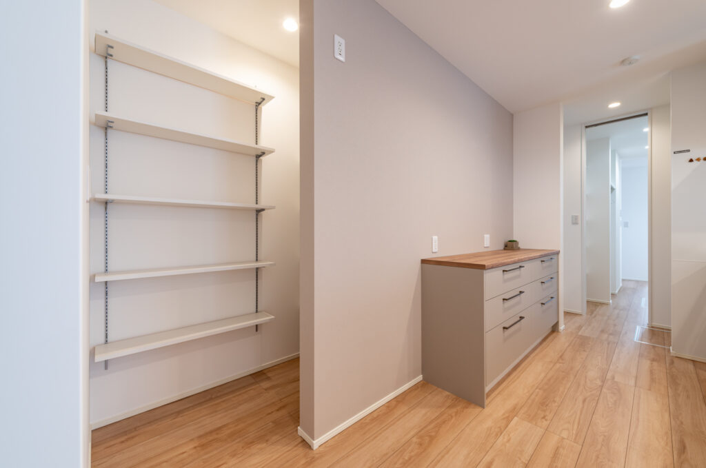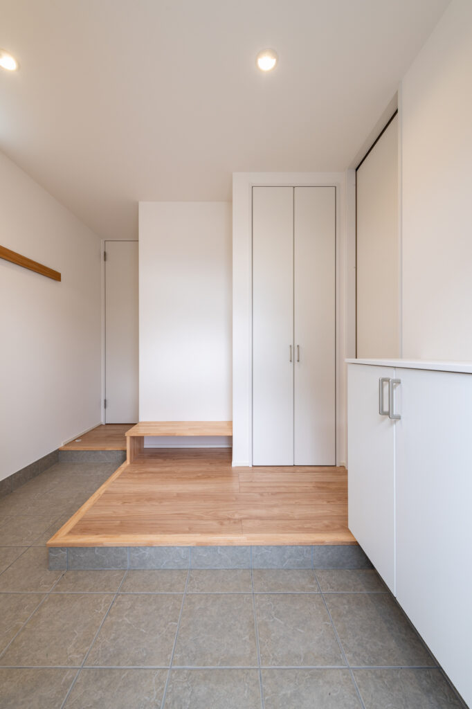 洗面台と可動棚を備えた玄関収納により、使い勝手を高めています。