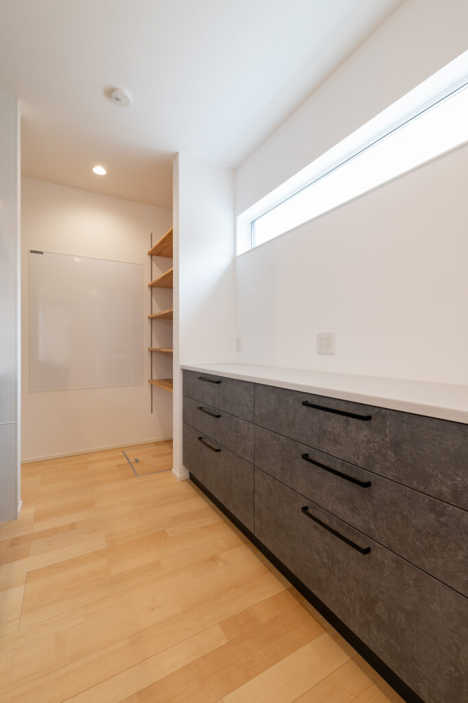洗濯から収納までを一つの場所で完結できる空間配置が、家事の時間を短縮し、日々の負担を軽くします。キッチンから洗面エリアへとつながる流れは、料理と洗濯を並行して進めやすく、忙しい朝も夕方も、スムーズに家事をこなせます。効率的な配置が、家族との時間を増やしてくれます。