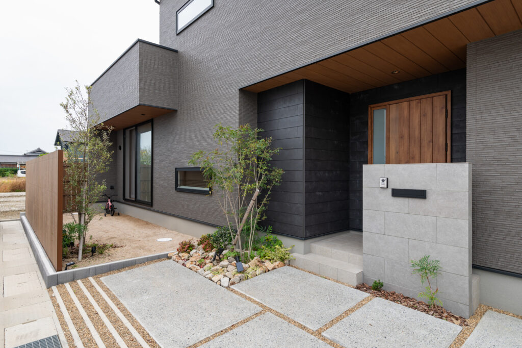 四角を組み合わせたような端正なフォルムに、異なる素材を重ねて表情をつけたOさん邸。木のぬくもりと無骨な風合いが共存する外観は、訪れる人を優しく迎え入れます。内部に足を踏み入れると、21.3帖の広がりを持つLDKが目に飛び込んできます。隣には20センチの段差で仕切られた和の空間が続き、家族それぞれの時間を包み込みます。