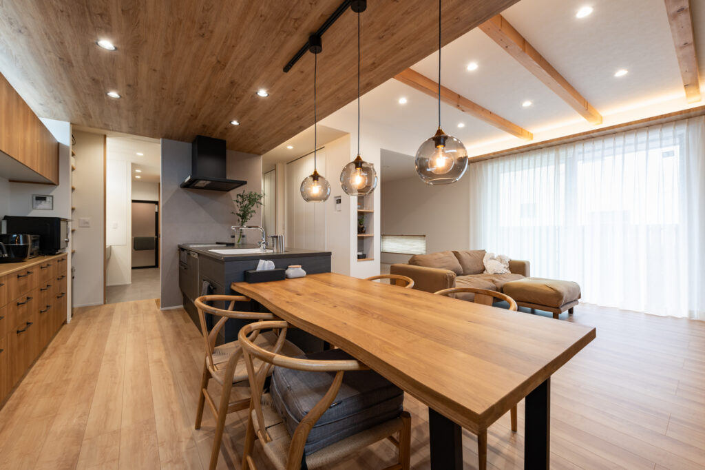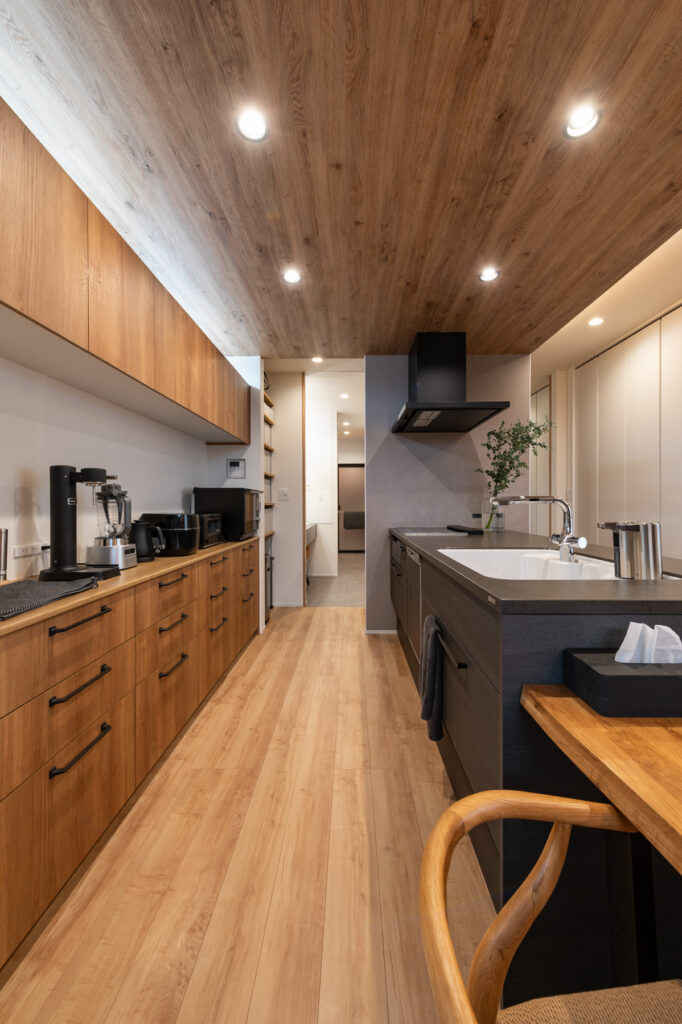 食事の場から視線を巡らせると、一枚一枚表情の異なる壁が目を楽しませてくれます。木の柔らかさの中に、シンプルな色合いで整えられた調理場が溶け込み、洗練された印象を醸し出します。高さを変えた天井が空間に奥行きを与え、背面には作業や学びのための小さなコーナーも設けられています。家族が自然に集い、それぞれの活動が重なり合う場所です。