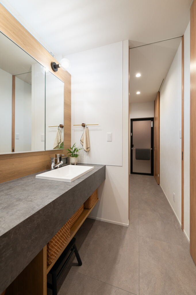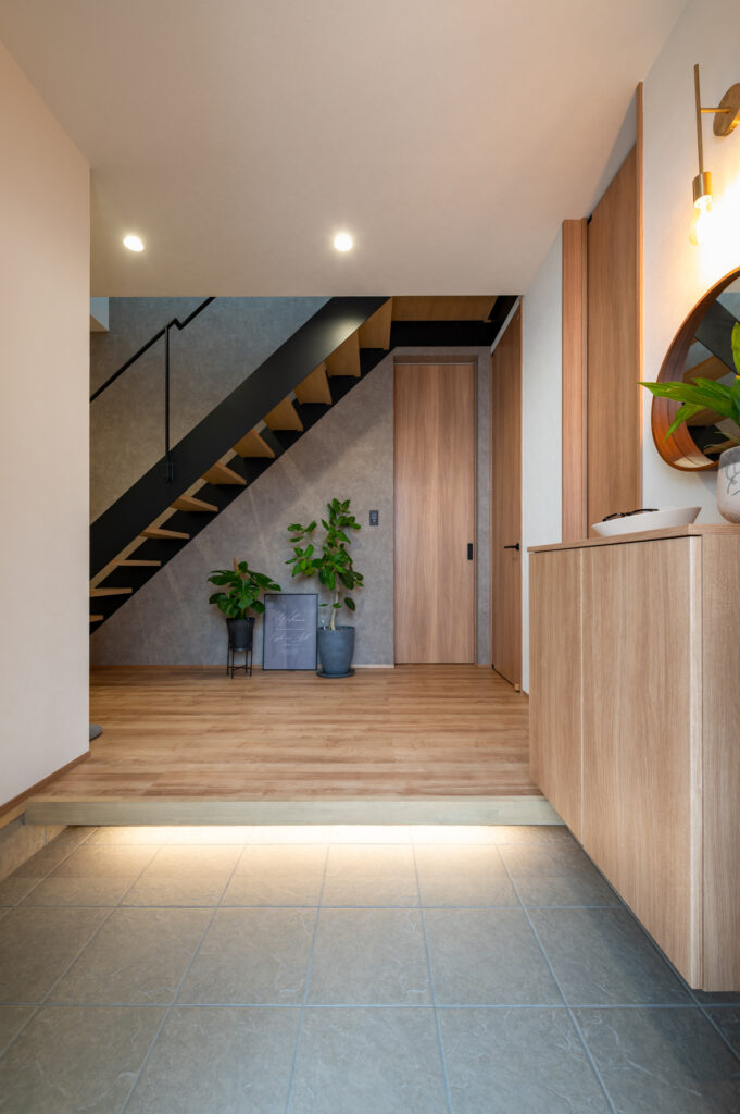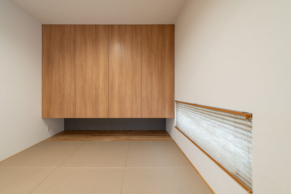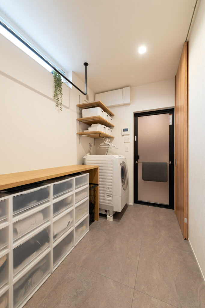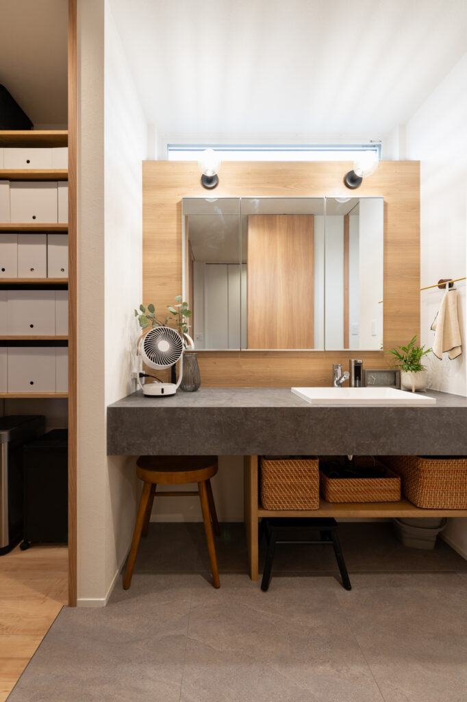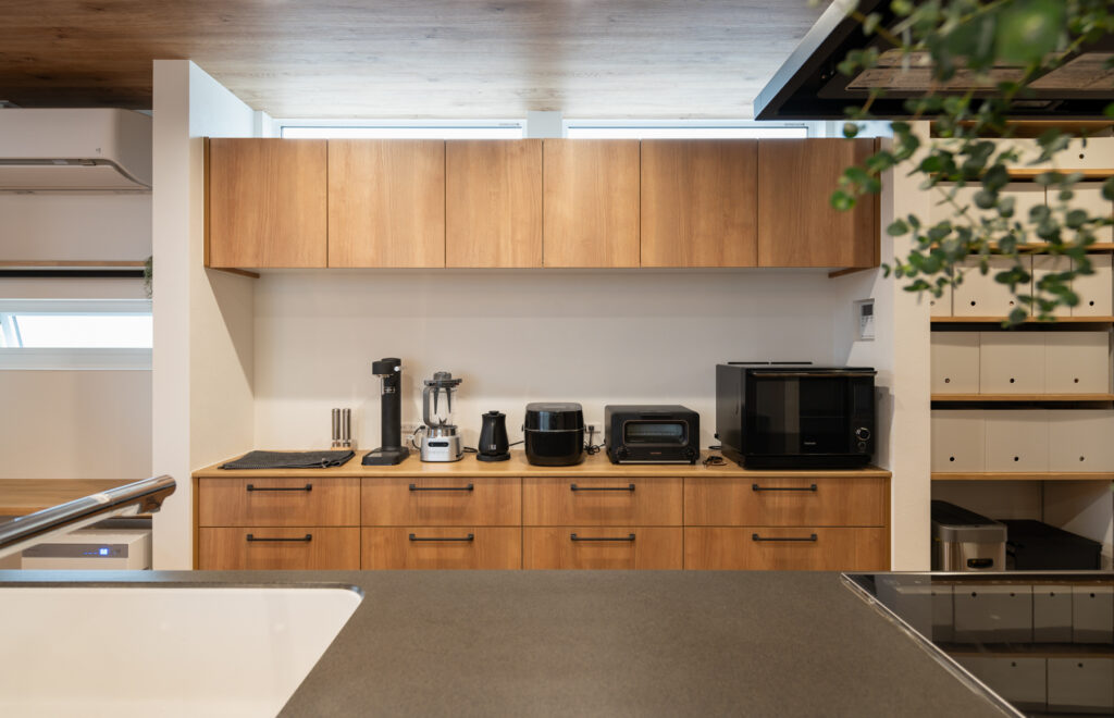 日々の営みをスムーズにする工夫が、住まいの随所に息づいています。食品庫から身支度の場へと続く一本の流れは、朝の忙しい時間を穏やかに変えてくれます。各階に設けられた衣類の保管場所や、外遊びの道具をしまえる玄関脇の空間、居間に並ぶ可動式の棚。必要なものがすぐ手に取れる配置が、いつも整った暮らしを実現しています。
