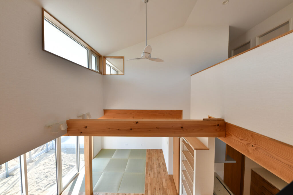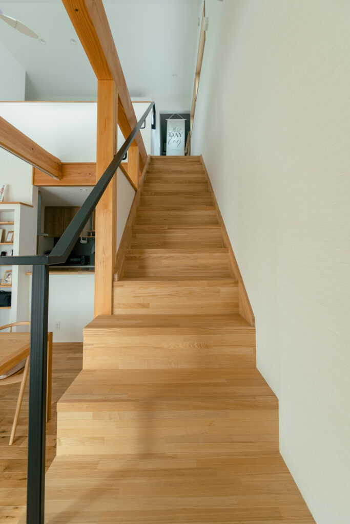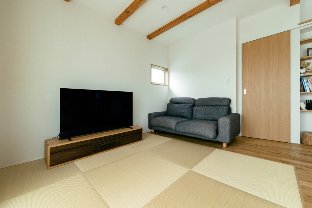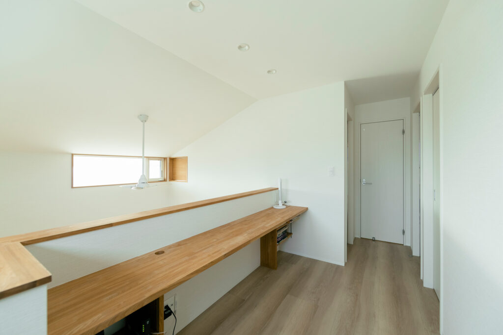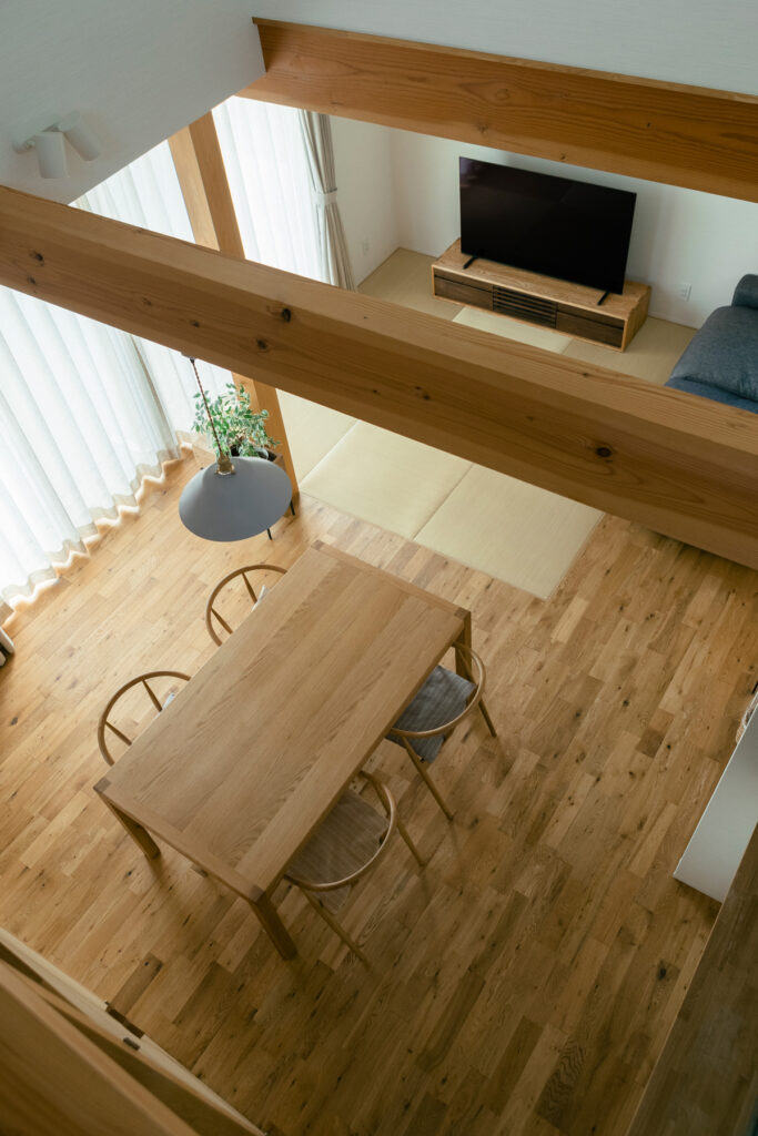 2階ホールに設けたスタディースペースは、お子さまの成長を見守る場所です。1階で過ごす家族の声や気配が自然と伝わり、ひとりでも寂しさを感じることはありません。リビングでは、床に座ってゆったりと過ごせる工夫が施されています。家族それぞれが思い思いの時間を過ごしながらも、緩やかにつながり合える空間構成が、日々の暮らしを豊かに彩ります。