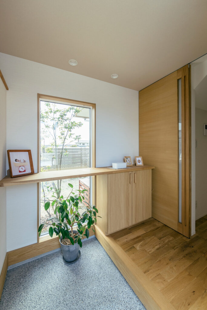 日本の美意識をさりげなく取り入れた住まいのNさん邸。木が持つ安定感が室内を満たし、訪れる人を静かに迎え入れます。コンパクトな玄関には工夫が施され、実際の広さ以上の開放感を感じられます。植物を育てることが好きな奥さまのために設けた飾り棚は、道行く人の目も楽しませてくれる場所となりました。