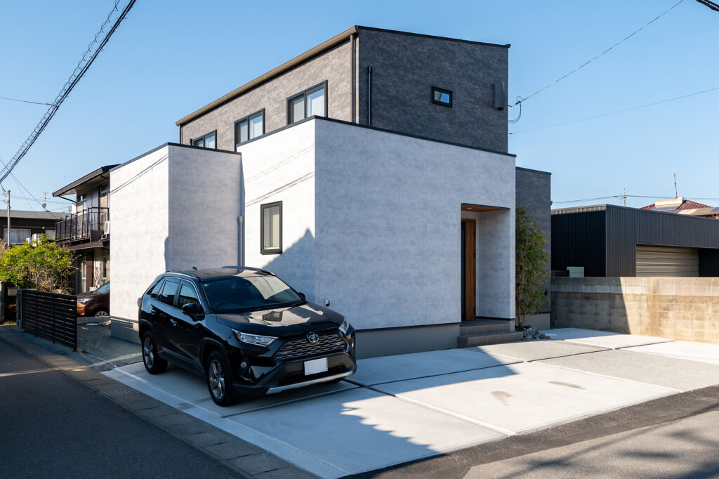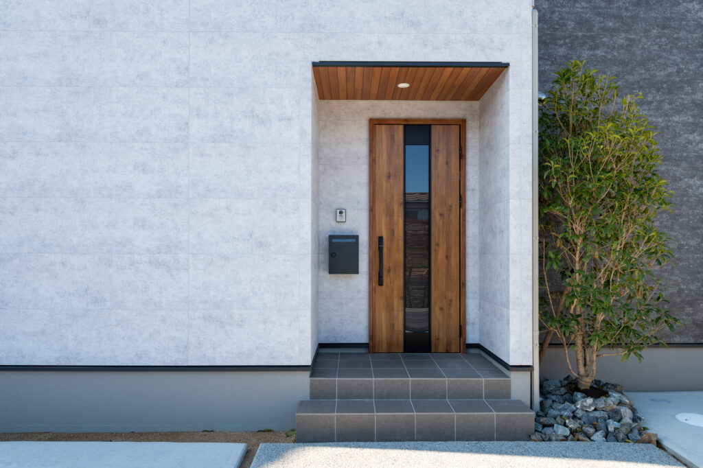 モノトーンを基調とした外観に、木調の軒天とドアがアクセントになっています。