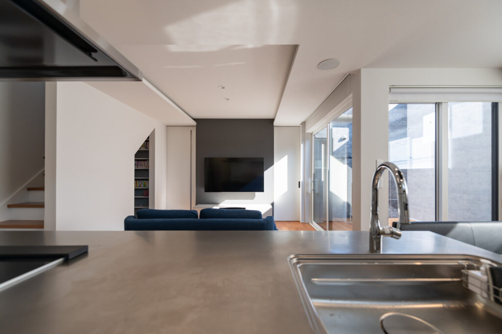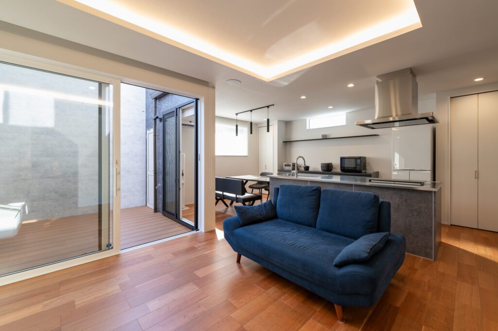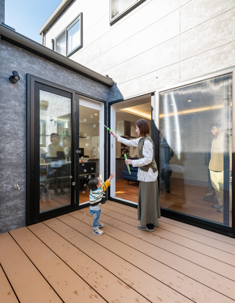 カーテンなしで過ごせる住まいが念願だったKさんご家族。建物が囲むように配置された中庭は、外からの視線を気にせず、家族がのびのびと過ごせる場所です。日中はお子さまの遊び場として、夜はBBQを楽しむ空間として。内と外の境界が曖昧になり、毎日が心地よく流れていきます。