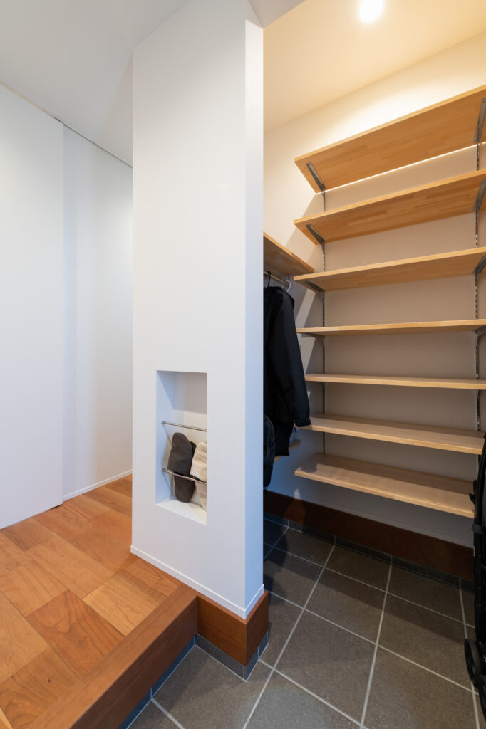 玄関から洗面コーナー、脱衣室、そしてリビングへ。ひとつながりになった間取りは、忙しい朝も、帰宅後の時間も、無駄なく過ごせるように考えられています。奥さまこだわりのキッチンは、洗練された佇まいで料理の時間を楽しくします。ご主人専用の小さなこもり空間は、仕事や趣味に集中できる大切な居場所です。