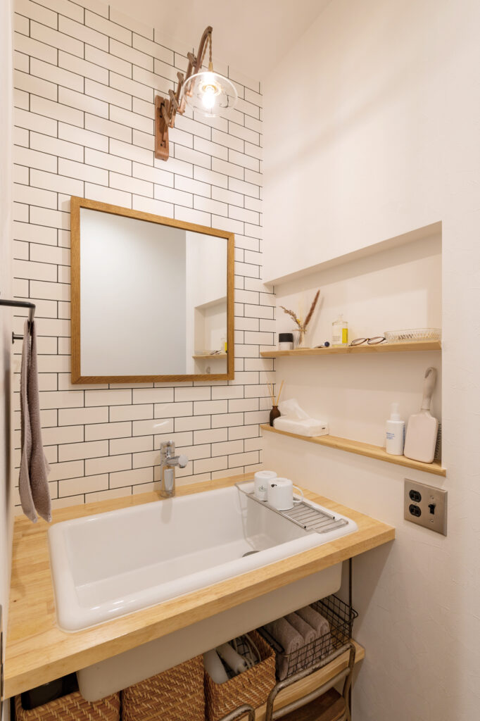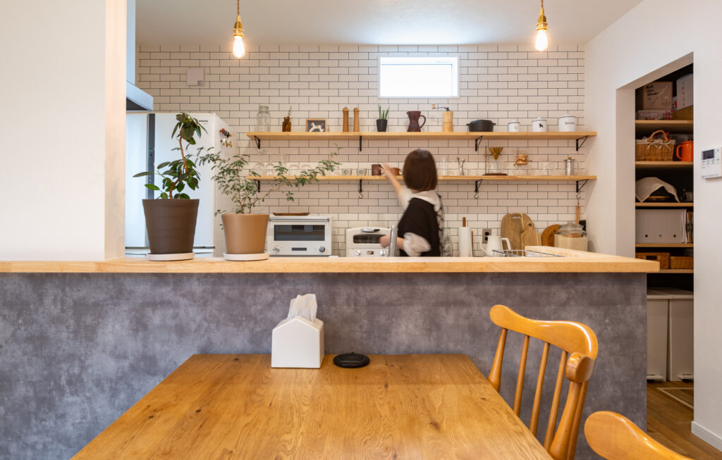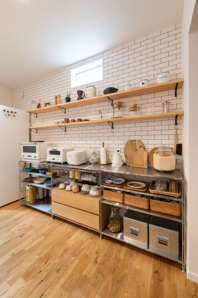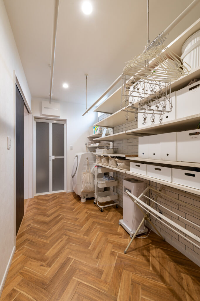 暮らしやすさを追求し、リビング、洗面室、ランドリールーム、キッチンをスムーズに移動できる回遊動線を採用しました。キッチン横には大容量のパントリーを備え、使い勝手に優れています。タイル調の壁紙で統一感を演出するなど、機能性とデザイン性を両立。家事が楽になる住まいを実現しています。