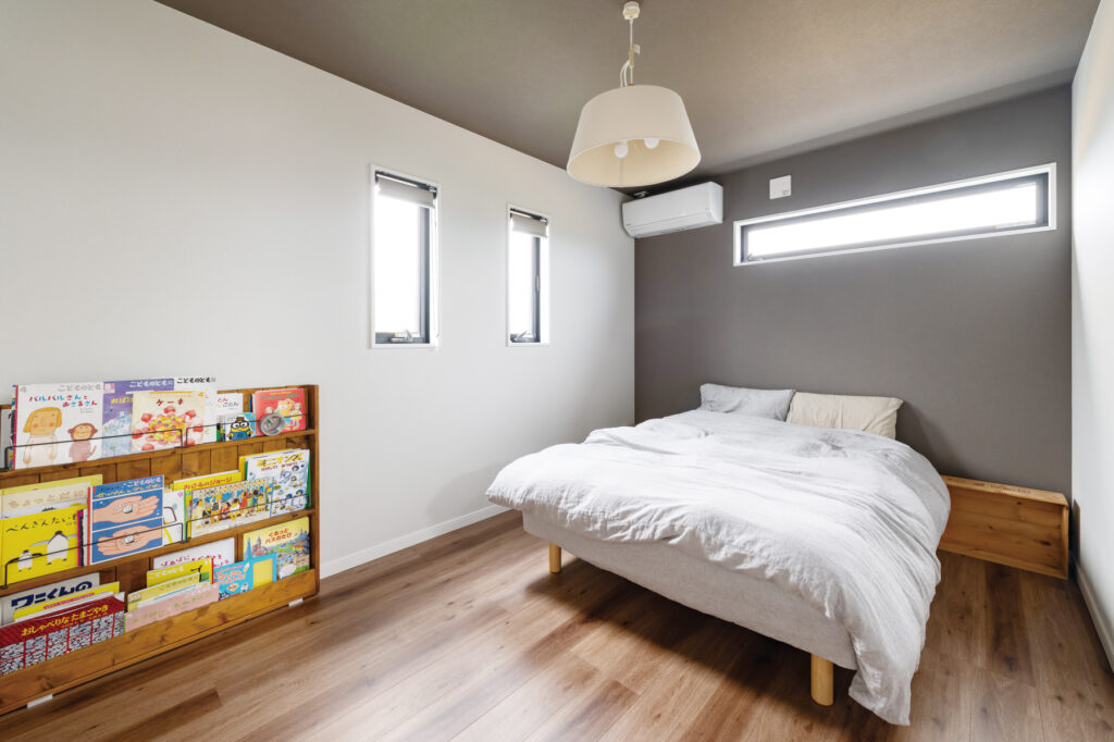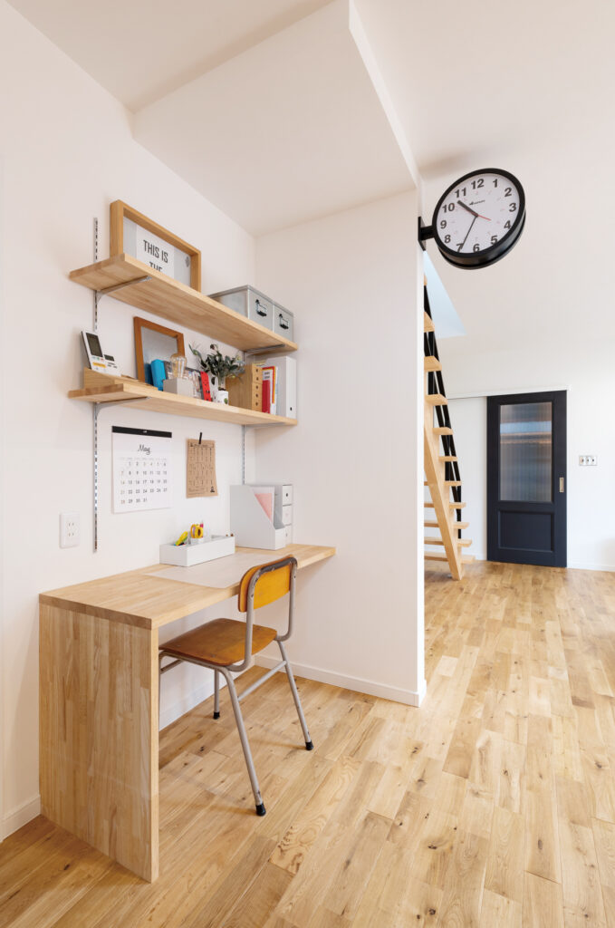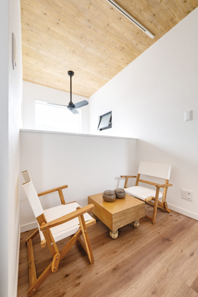 2階ホールは、吹き抜けを介して1階とつながる家族団らんの場。囲碁を楽しむなど、ゆとりある設計が魅力です。吹き抜けに面しているので、家族の気配を感じられます。主寝室の一角には、無骨なインテリアで仕上げたご主人の専用書斎を配置。好きなものに囲まれて、趣味などに没頭できる空間です。