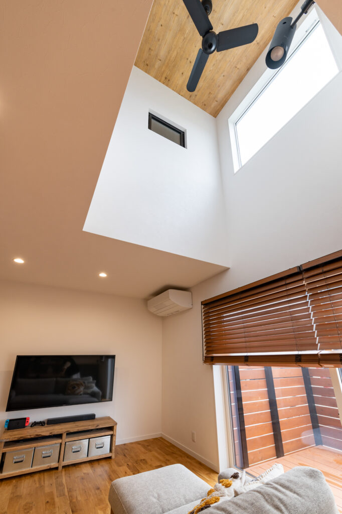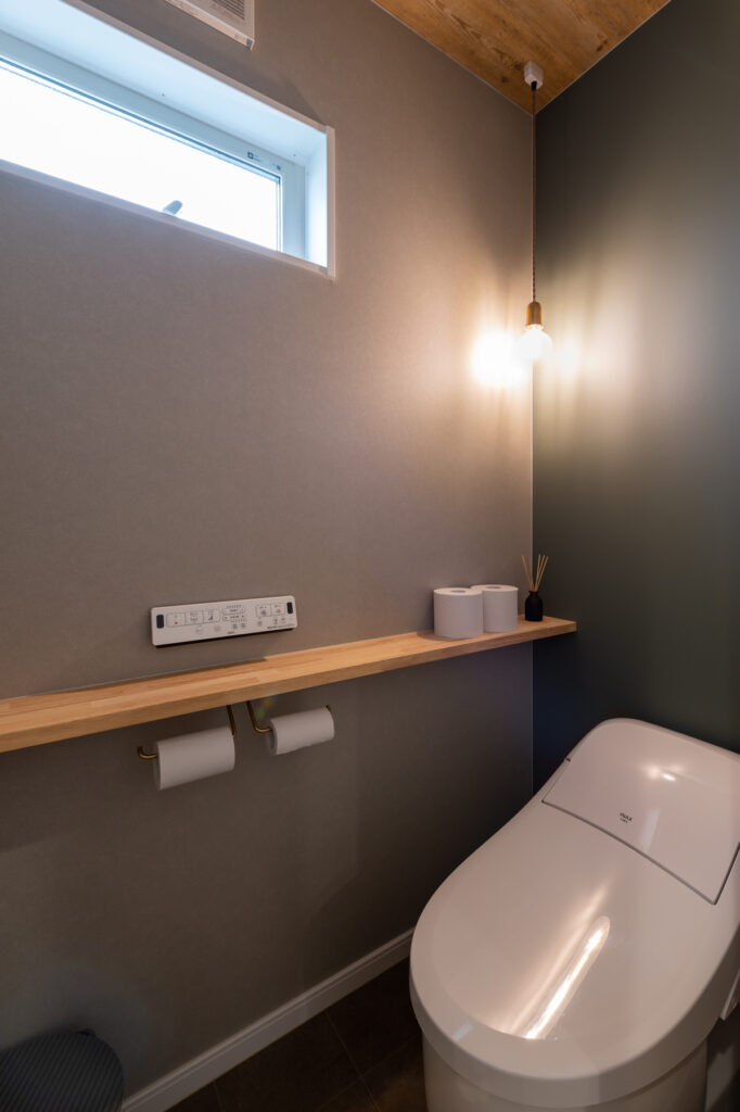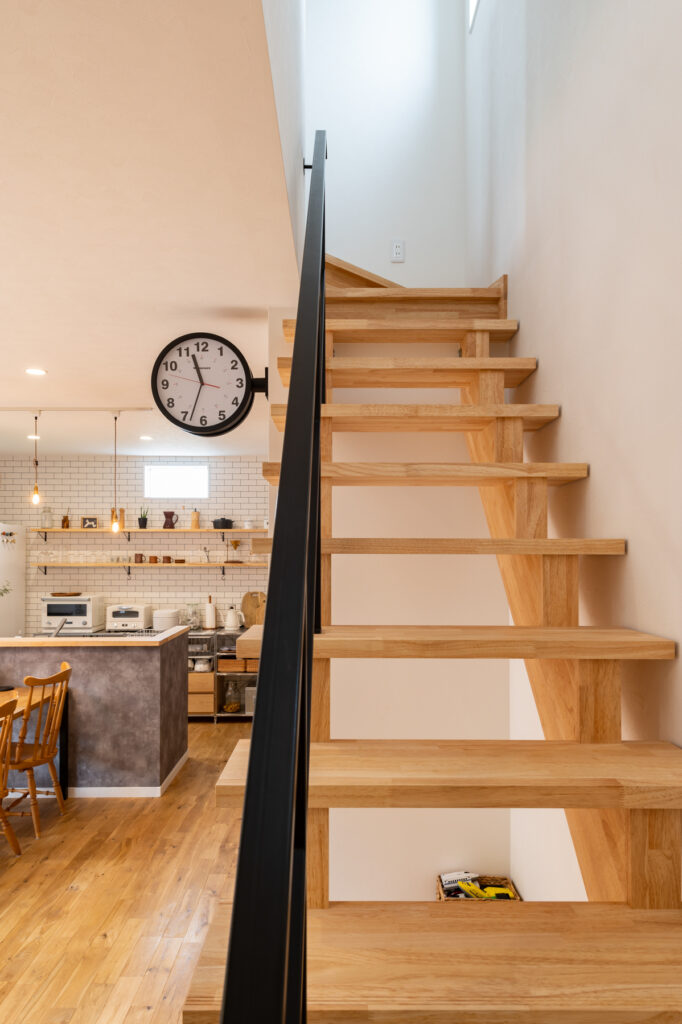 グリーンの外壁に木調が映える、シンプルで愛らしい外観が目を引くIさん邸。一歩中へ入ると、吹き抜けと大きな窓から陽光が降り注ぐ、開放感あふれるLDKが広がります。施主のこだわりが詰まったカフェのような空間は、厳選されたキッチン用品やアンティーク調の照明が彩りを添え、日々の暮らしに豊かなものにしています。