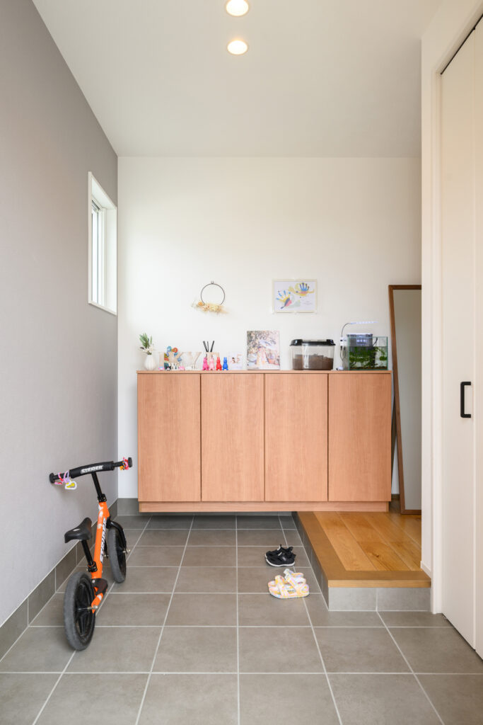 LDKにはオープンキッチンとスタディーコーナーを配置し、育ち盛りの子どもたちと過ごす時間を大切にしています。奥さまご希望の人工芝の庭はとても開放的です。コンクリートデッキと組み合わせてバーベキューや水遊びも楽しめます。ご主人たっての希望である5帖の洗面所兼洗濯室は、家族4人分の室内干しにも十分な広さです。L字の上がり框は、大勢のゲストを迎える際にも活躍します。