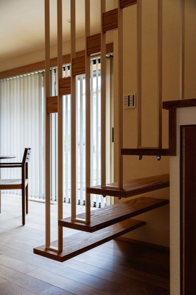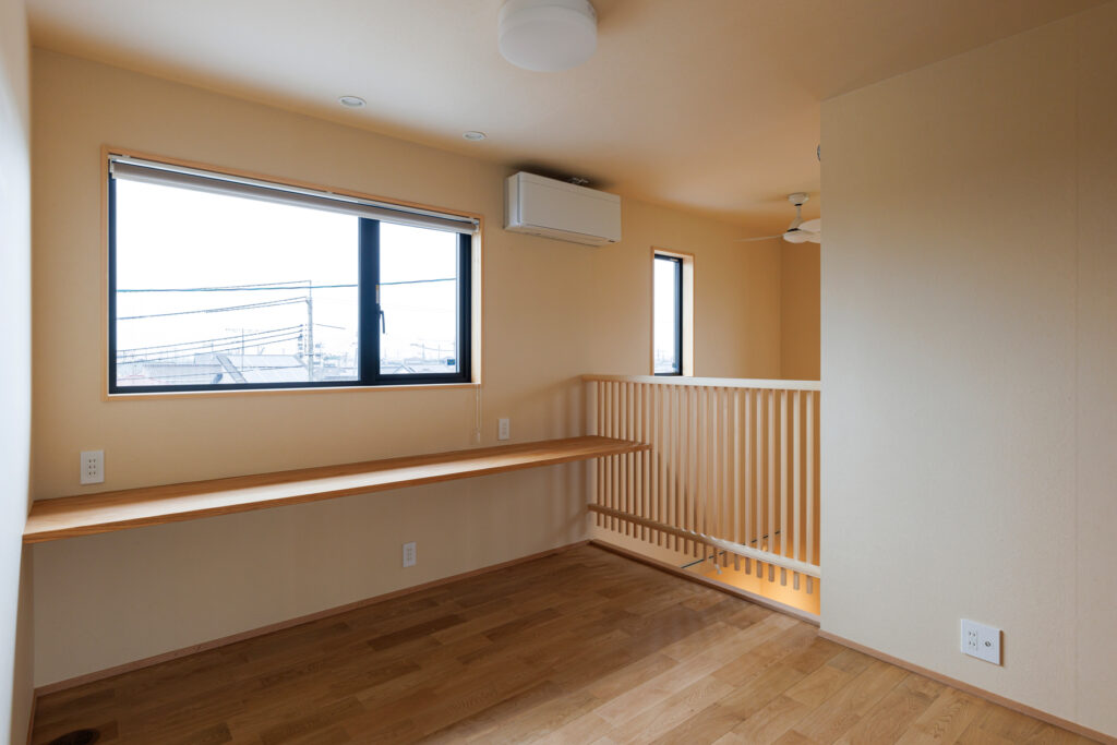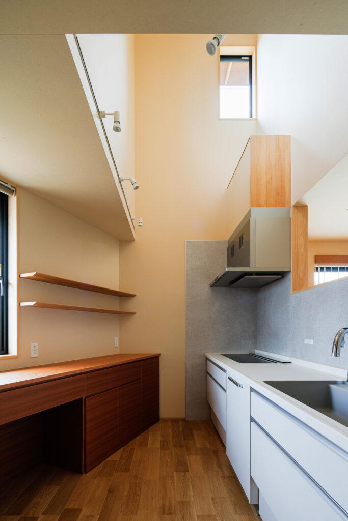 内装には大工が手掛けた造作家具や洗面台、建具を随所に設置。素材選びから仕上げまで一貫して手作業で仕立てられ、ぬくもりと個性が感じられます。キッチン上部の吹き抜けは2階の書斎とつながり、家族の存在を身近に感じられる開放的な設計です。