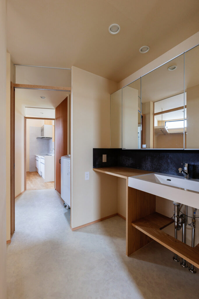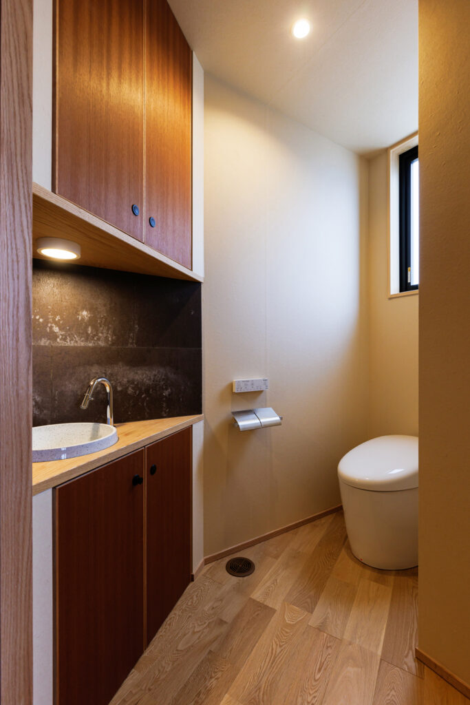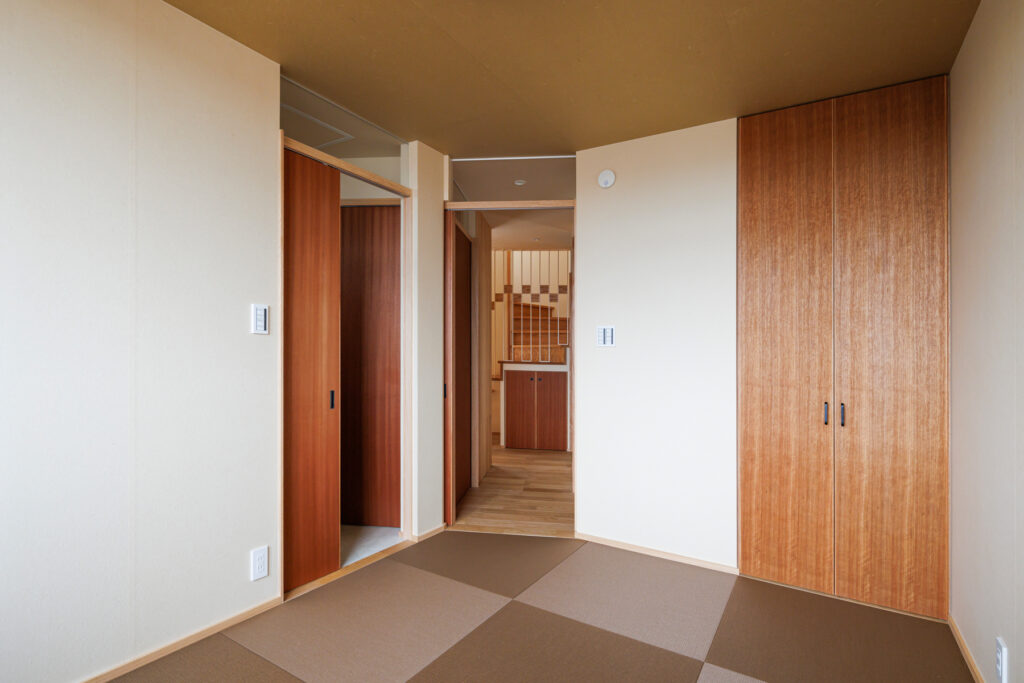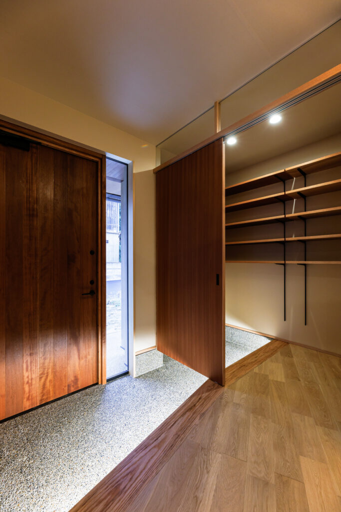 キッチンから洗面室、ウォークインクローゼットまで直線的に移動できる回遊動線を採用。家族の行動パターンを考慮し、適所に収納を配置することで日々の片付けや支度が効率的に。玄関横の土間収納は、趣味の道具や子どもの遊具まで幅広く収められる設計となっています。