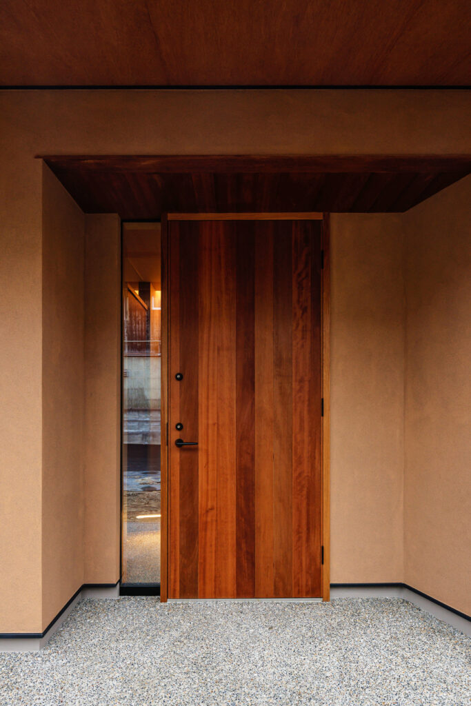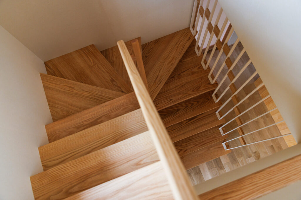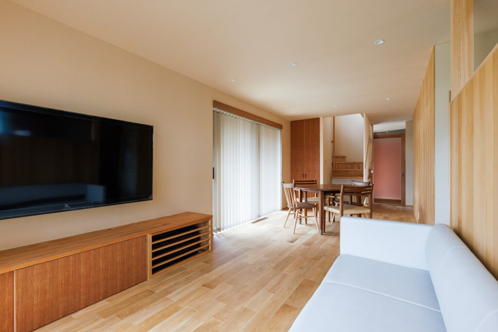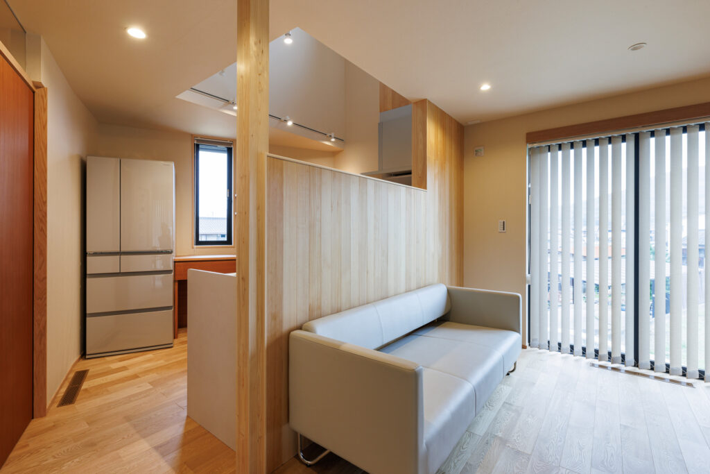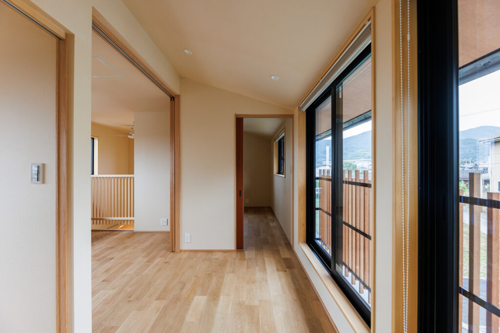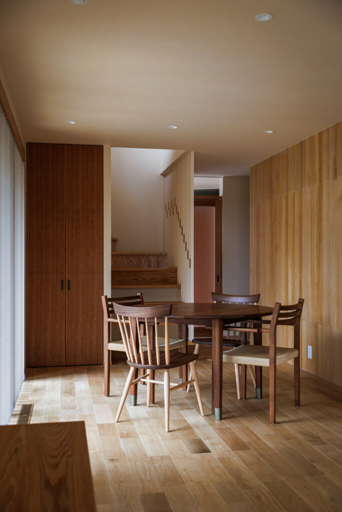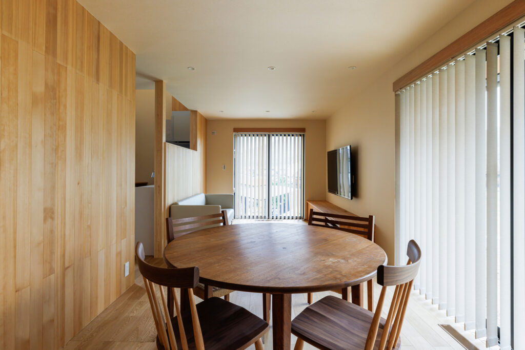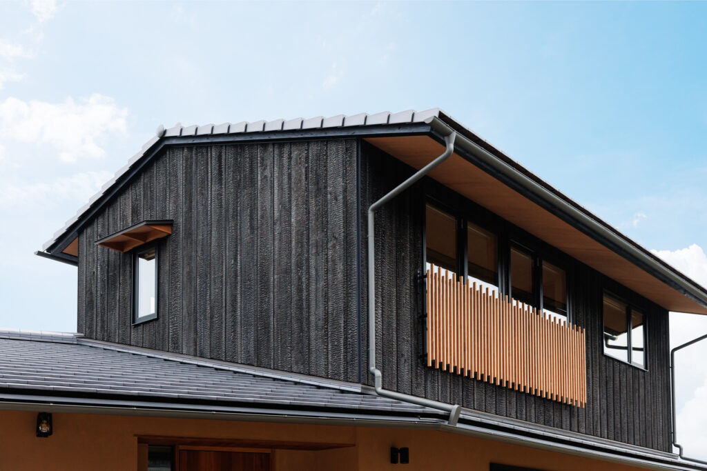 敷地の個性を最大限に引き出すため、建物の一部を115度の角度で配置。UA値0.48、C値0.2という高い断熱・気密性能を実現し、年間を通して快適な温熱環境を保ちます。外観には焼杉板を採用し、周囲の景観に溶け込む落ち着いた佇まいを演出。耐久性と意匠性の両立を図った設計です。
