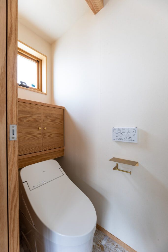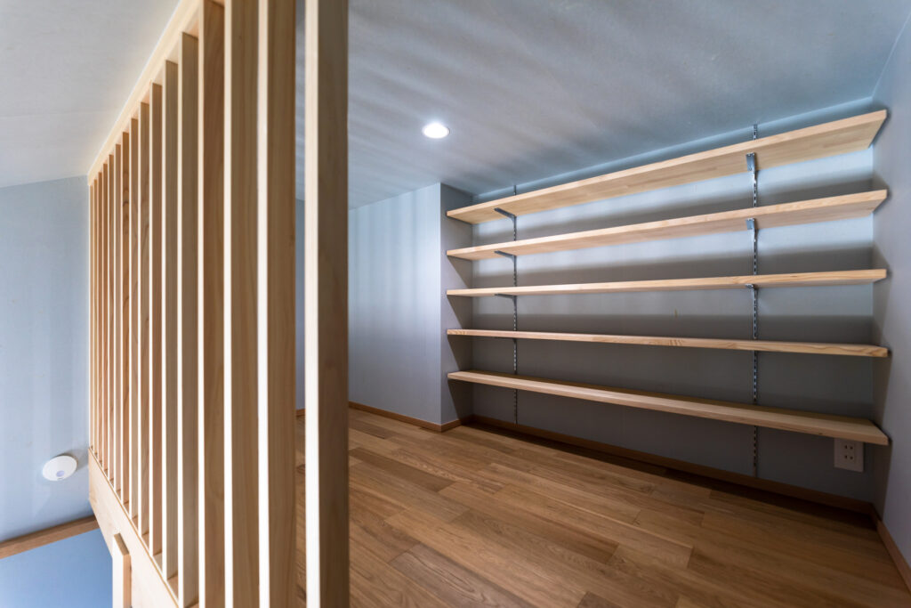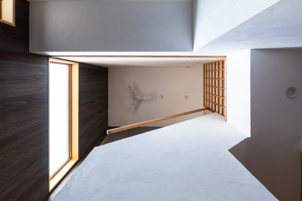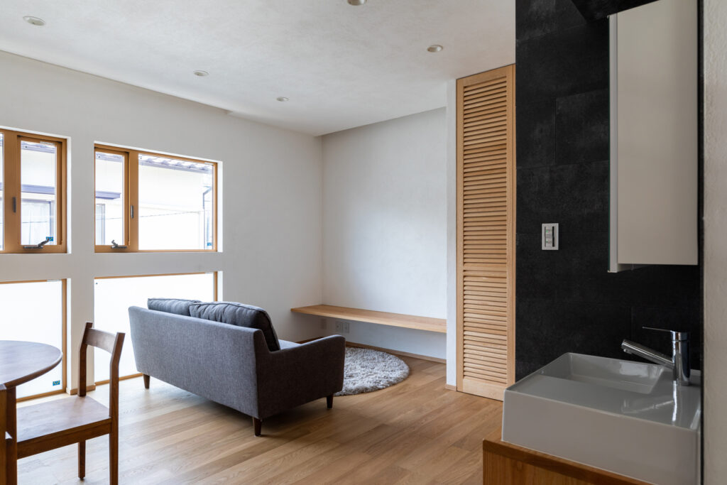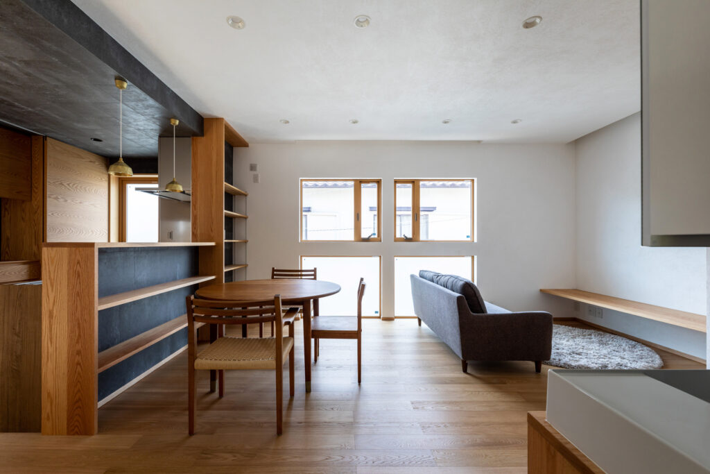 南面に大開口を据え、LDKを2階へ持ち上げた計画です。路面からの視線を外しつつ、日中は照明要らずの明度を確保します。回廊のように連なるキッチン・食卓・座席が程よく近接し、会話が途切れません。UA値0.26、C値0.3の性能で、夏冬ともにエアコン1台の省エネ運用が現実的です。可視化された採光計画が、1日のリズムを整えます。