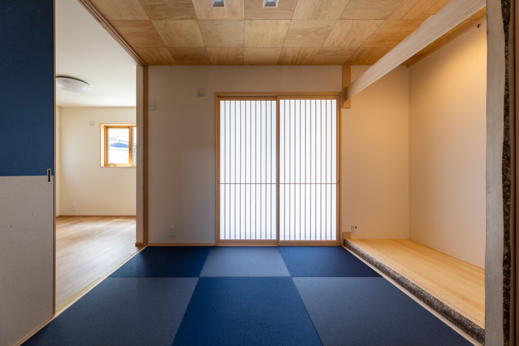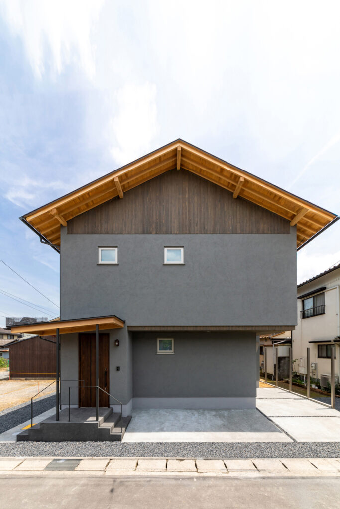 和室天井はヒノキコンパネを化粧使いに加工し、床柱には錆丸太を据えて陰影を引き出しました。玄関土間は三和土で仕上げ、壁は漆喰や和紙を部位ごとに選び分けています。外装はモルタル吹き付けに、ラフソーン仕上げ仕上げのスギを合わせて端正に。外観はグレーと木目の比率を調整して、より落ち着いた印象になっています。年月を重ねても飽きのこない表情です。