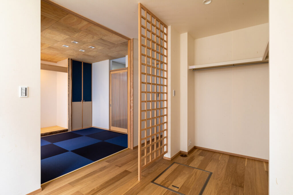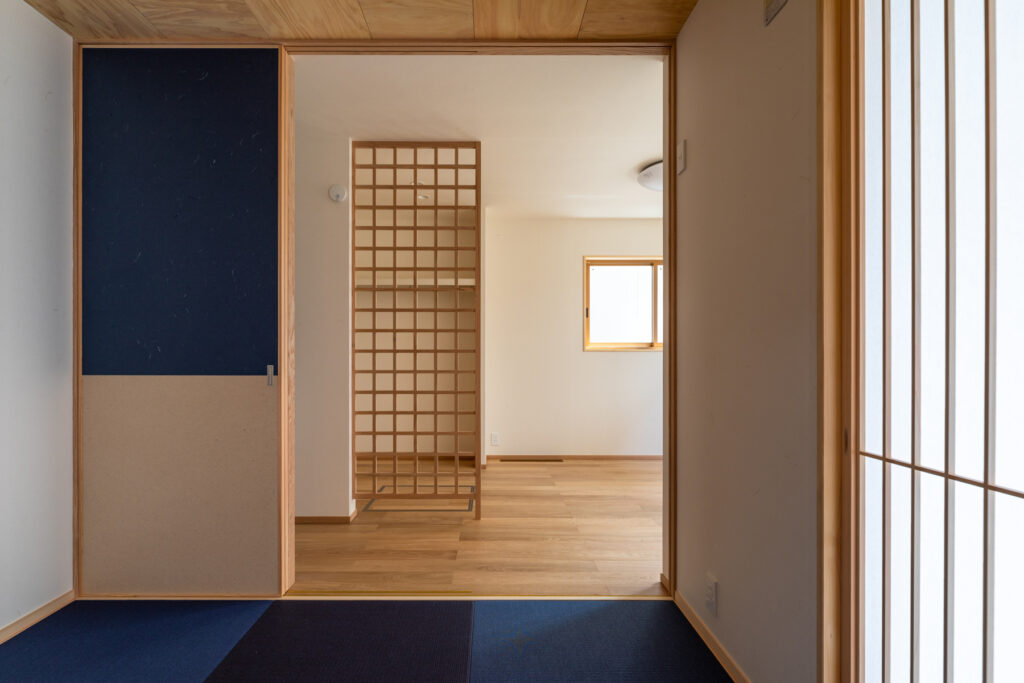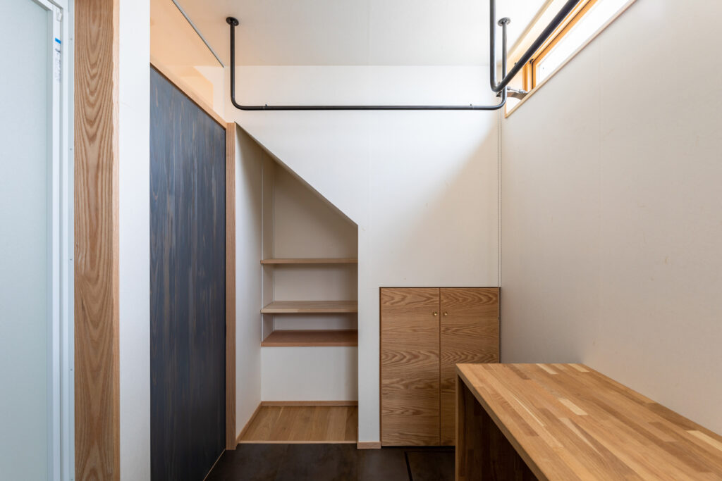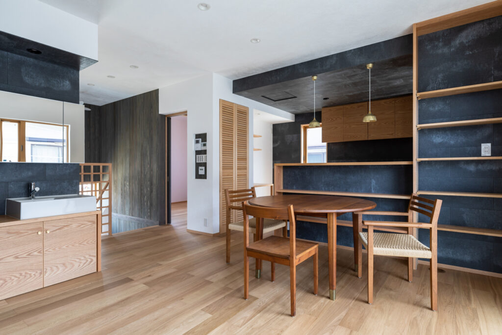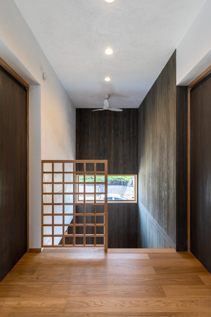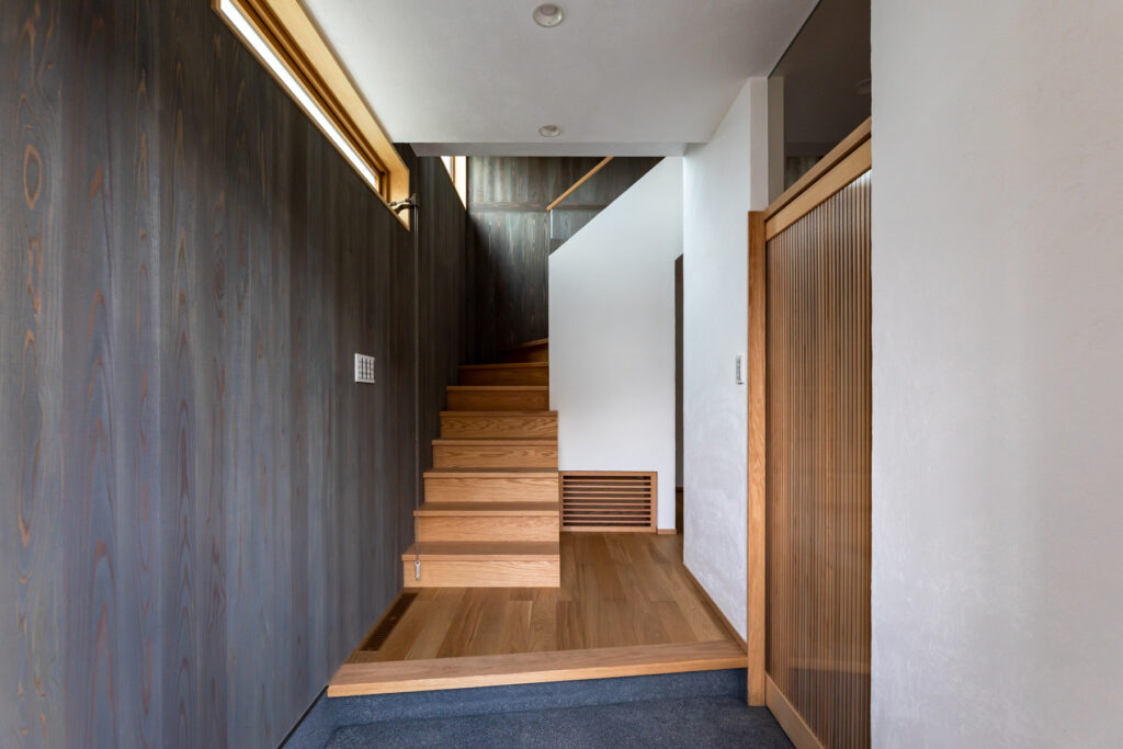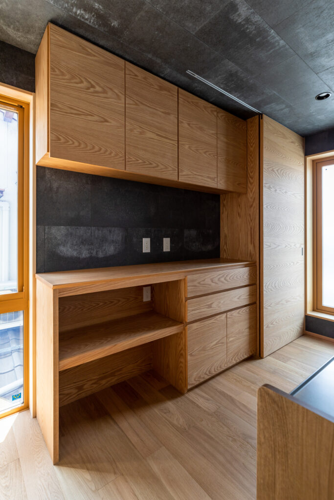 レッドオークの直線木目でまとめたカップボードと吊り収納を自社大工が製作。キッチン天井とカウンター、洗面まわりの壁には深みのあるタイルを選定しました。表情の異なる面材を隣接させ、質感差でメリハリを効かせています。建具は各室でスギを用い、1階の和室はヒノキへ切り替え。用途と湿度域に合わせ、反りと触感まで踏まえた提案です。