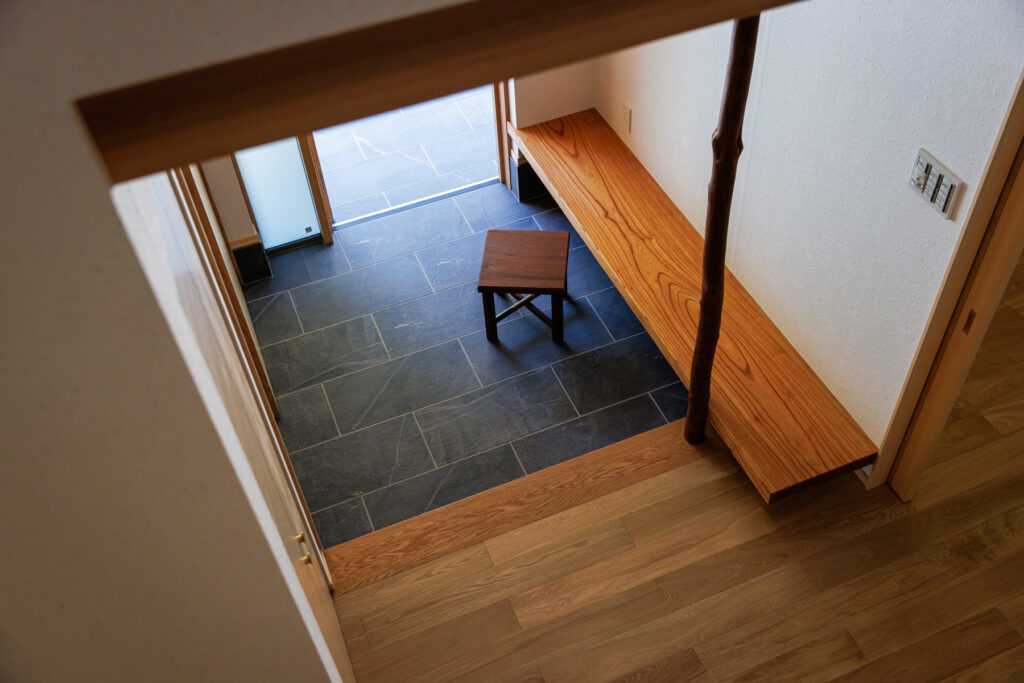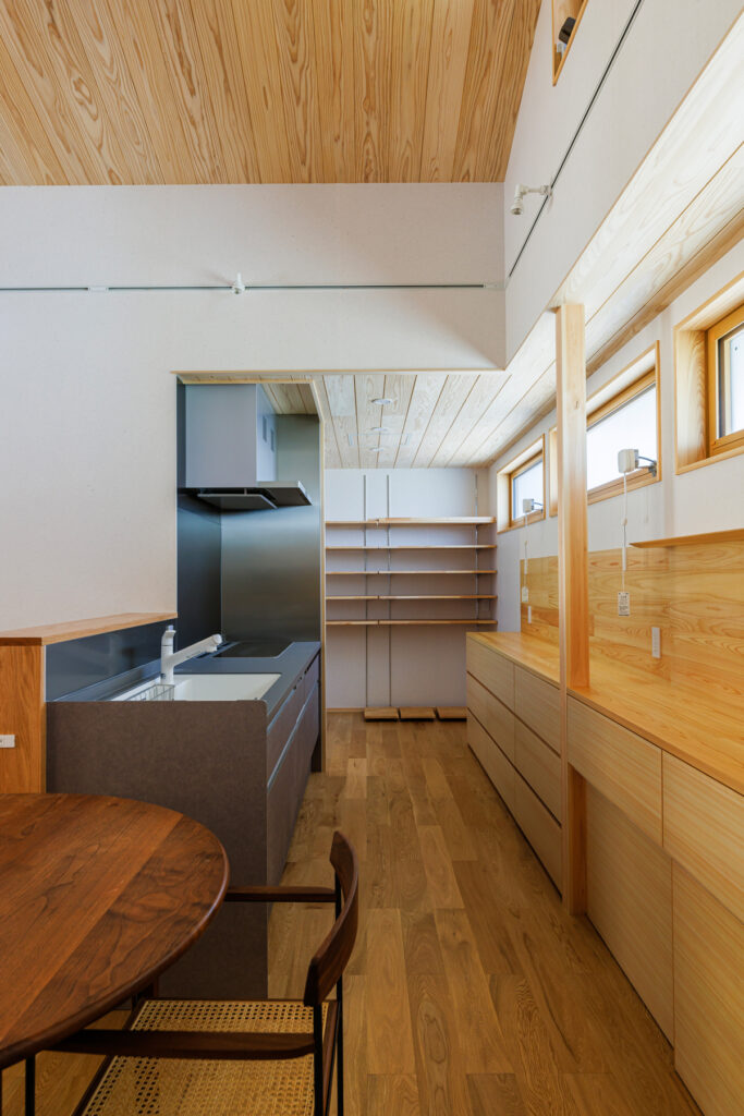 大工の手仕事による大容量の食器棚は、木の質感がぬくもりを添えながら、生活用品を美しく隠す機能性を備えています。畑からの収穫物を直接運び込めるパントリー、玄関脇の土間収納、そしてウォークインクローゼットへと続く回遊動線が、日々の家事時間を大幅に短縮。適材適所に配された収納群が、ご夫婦の動きに自然と呼応します。