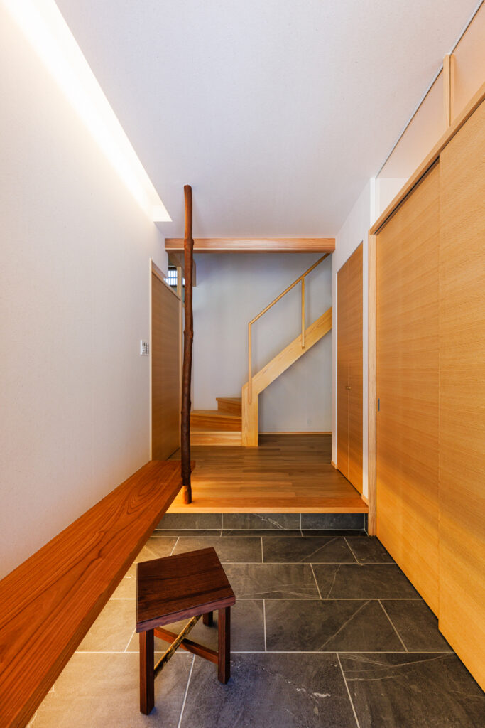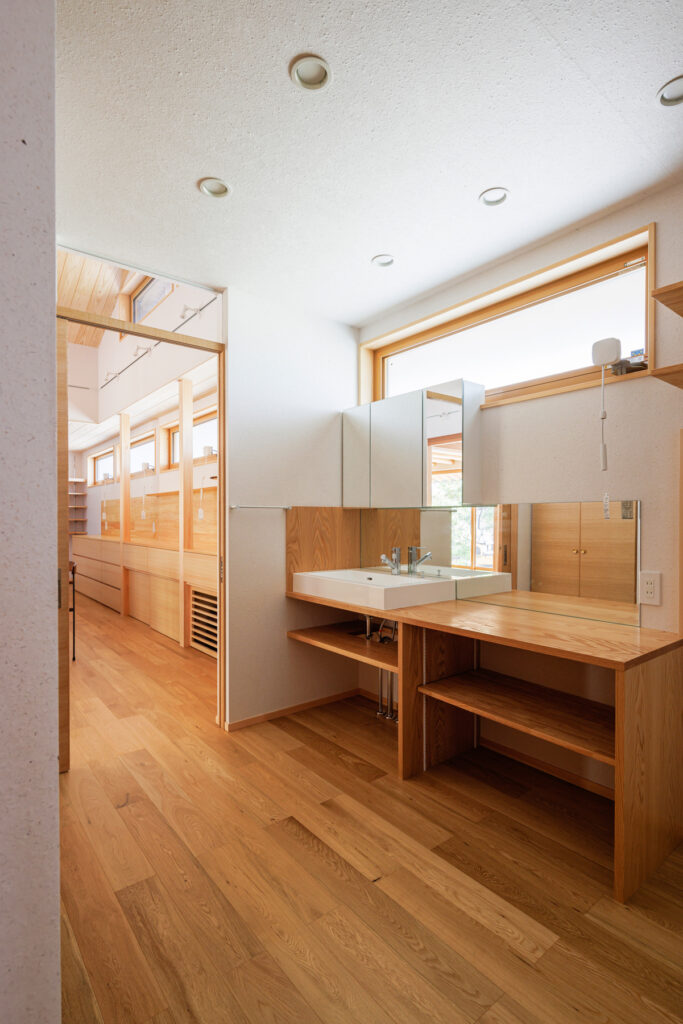 洗面台、建具、そして各所の造作家具に至るまで、すべてが大工集団・木創の手によって生み出されました。内装の雰囲気に調和する木材を厳選し、住まい手の個性を映し出すオリジナルの仕上げを実現しています。無垢材の風合いと職人の丁寧な仕事が、経年とともに深まる愛着を育む唯一無二の住環境を完成させました。4LDK+2Sの間取りです。