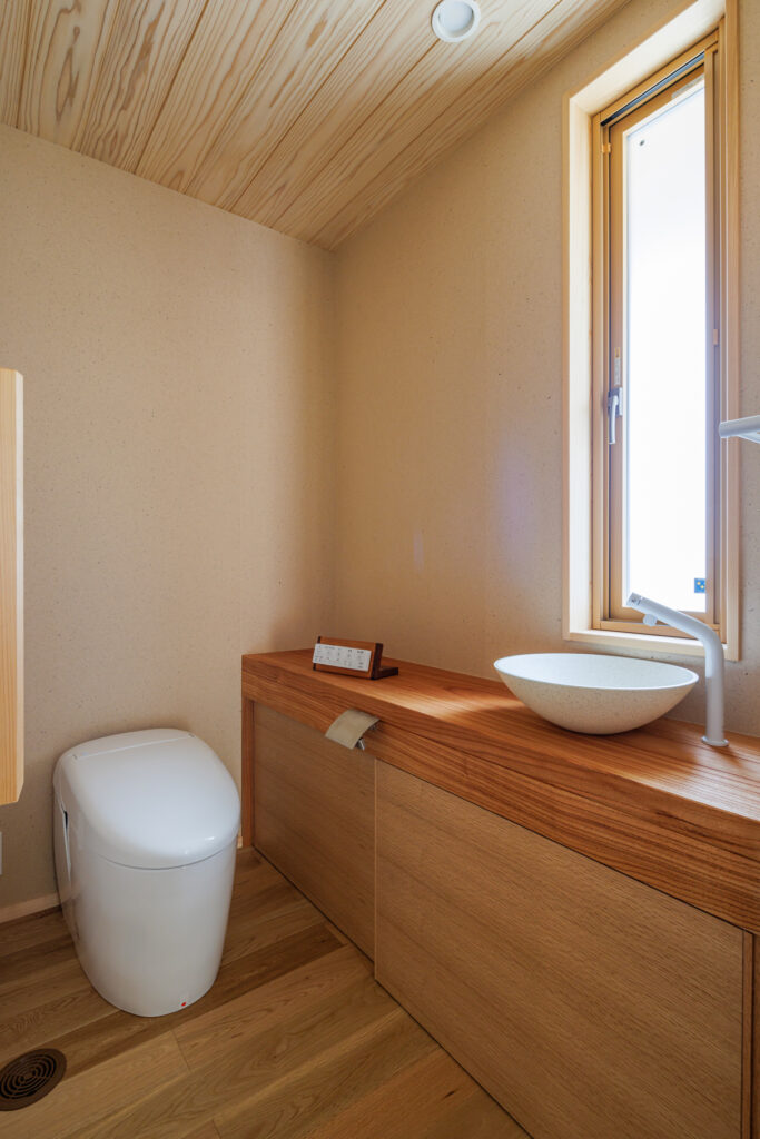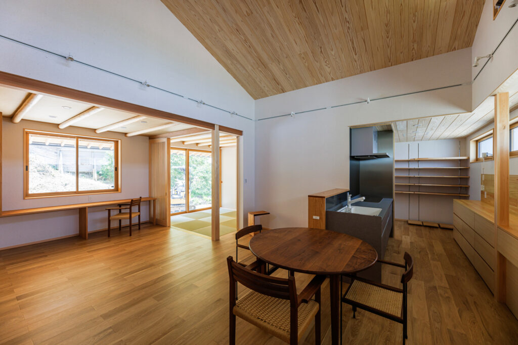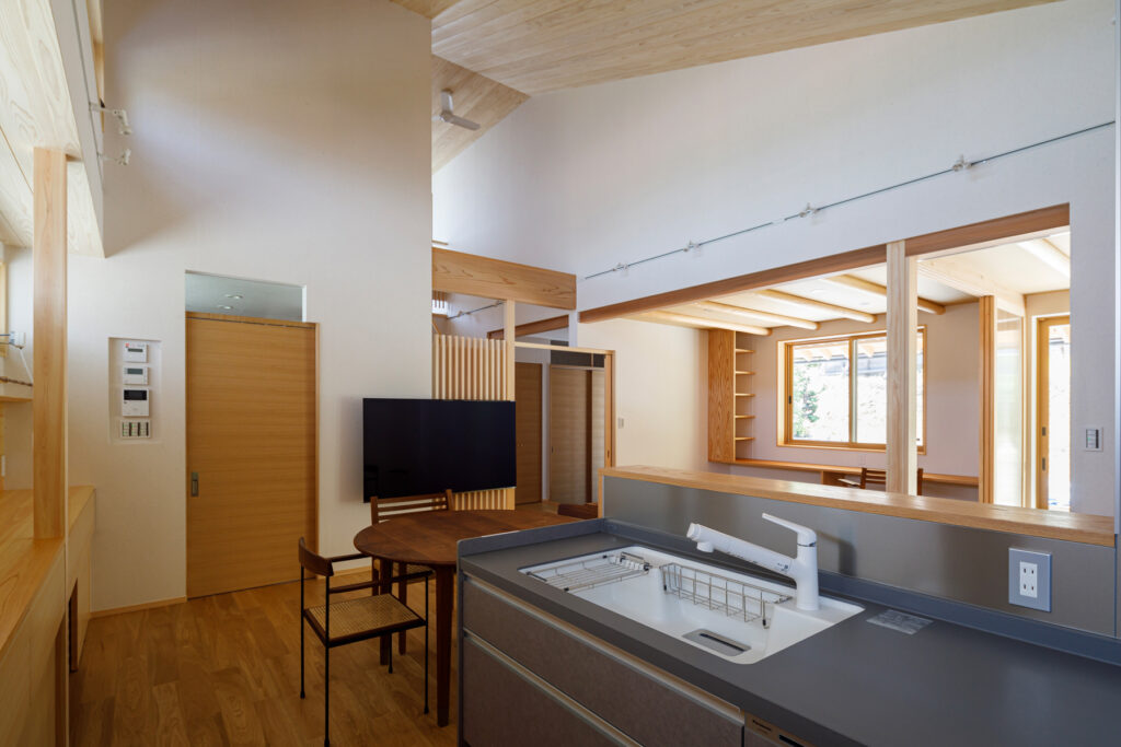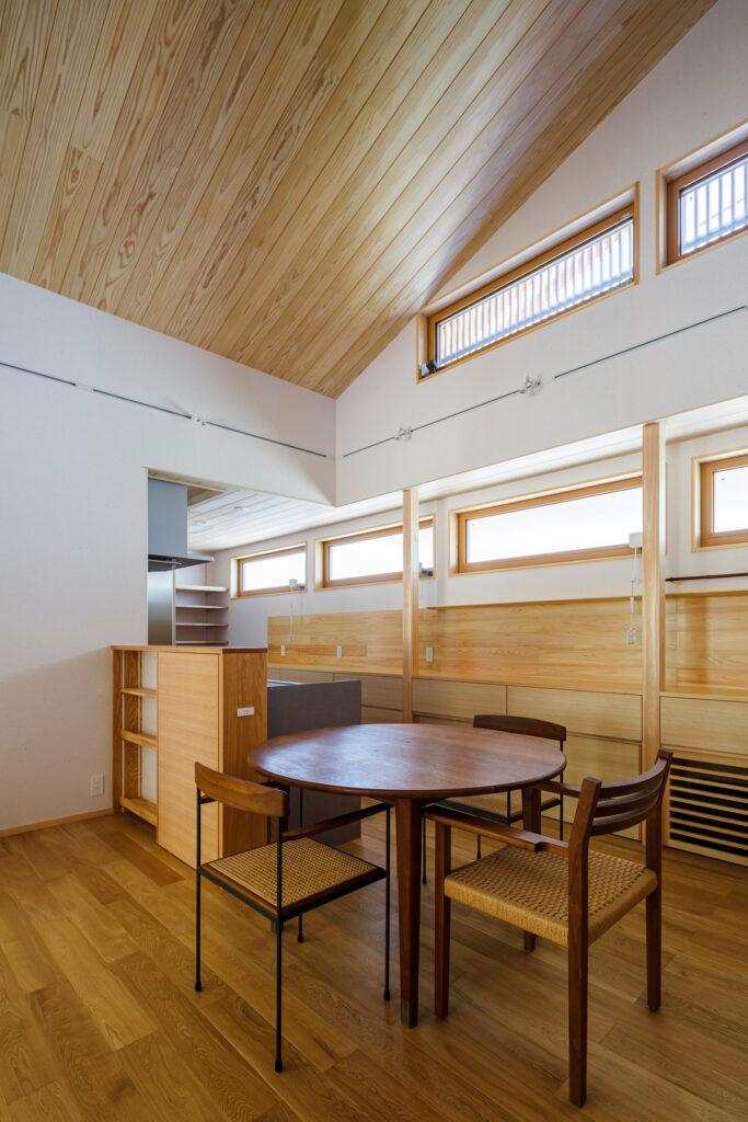 屋根の傾斜を巧みに生かした吹き抜けが、LDK全体に伸びやかな広がりをもたらしています。UA値0.35、C値0.16という卓越した断熱・気密性能により、エアコン1台で館内すべてを快適に保つことが可能です。勾配天井の下、家族の声や足音が心地よく響き渡り、どこにいても互いの存在を穏やかに感じられる設計となっています。