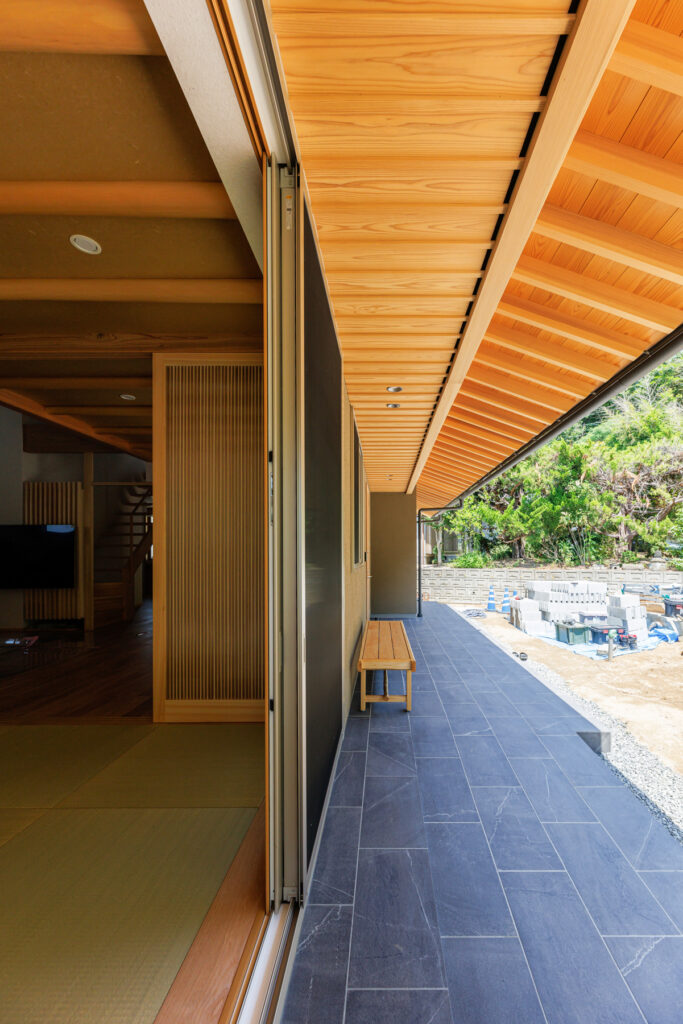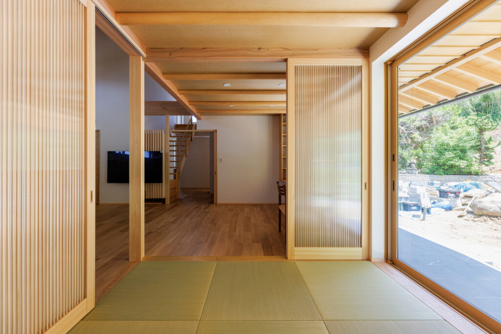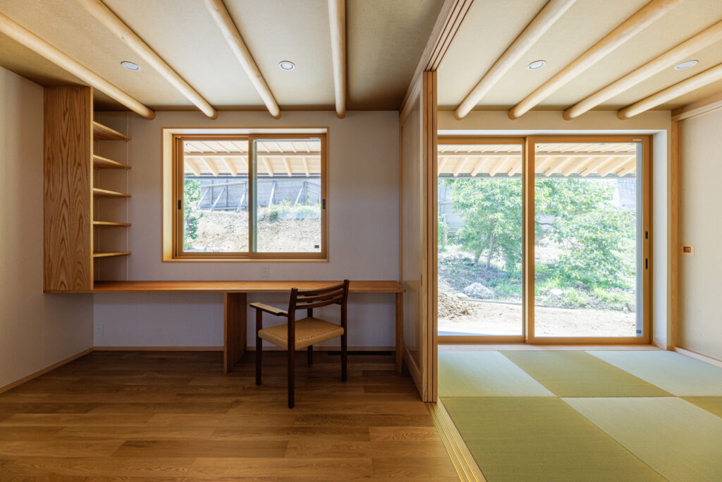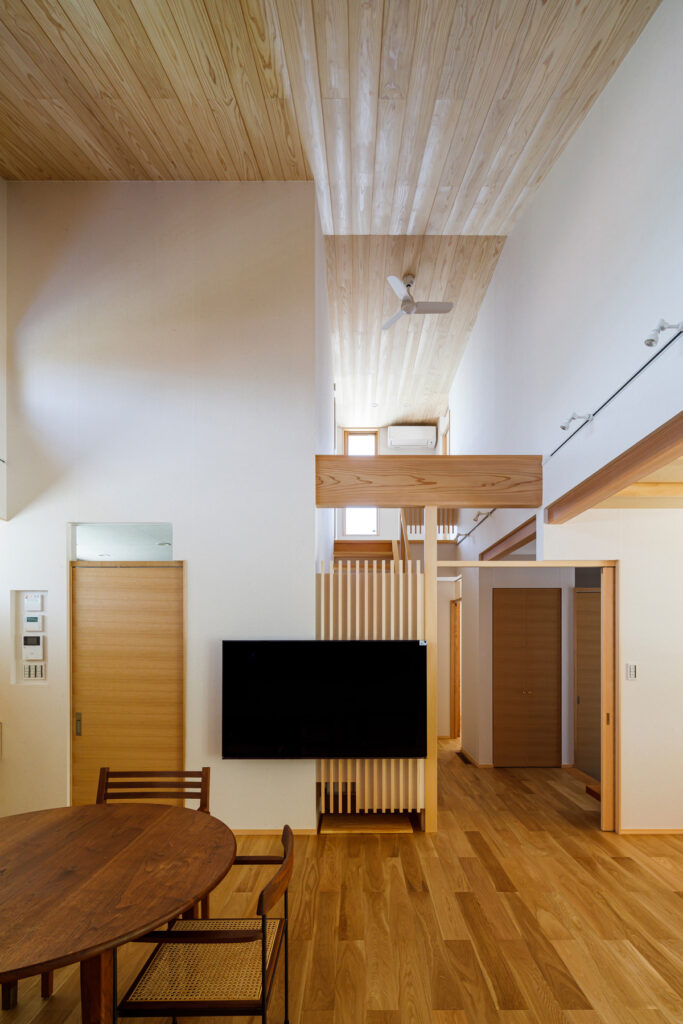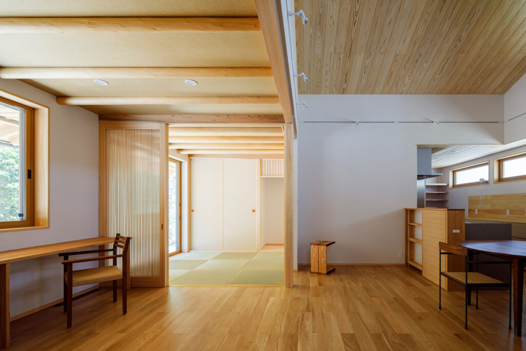 屋根の傾斜を巧みに生かした吹き抜けが、LDK全体に伸びやかな広がりをもたらしています。UA値0.35、C値0.16という卓越した断熱・気密性能により、エアコン1台で館内すべてを快適に保つことが可能です。勾配天井の下、家族の声や足音が心地よく響き渡り、どこにいても互いの存在を穏やかに感じられる設計となっています。