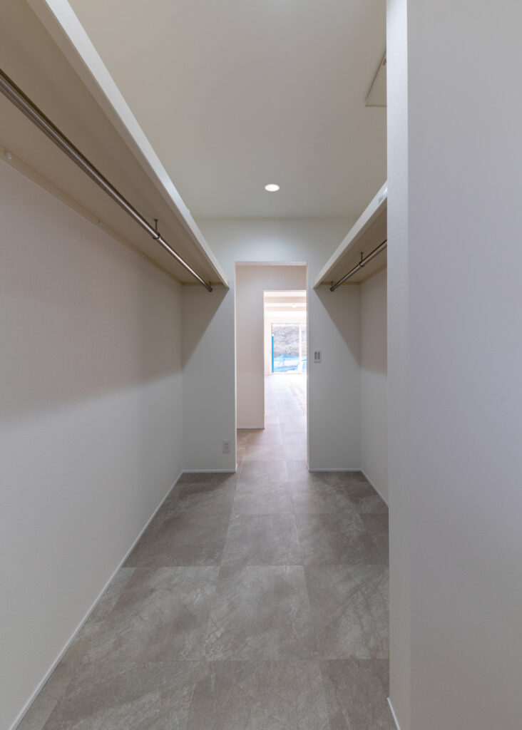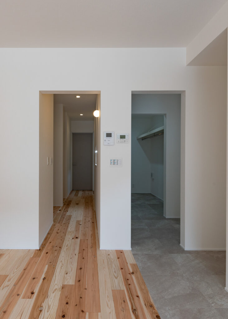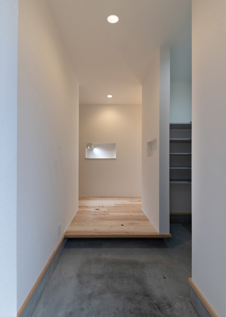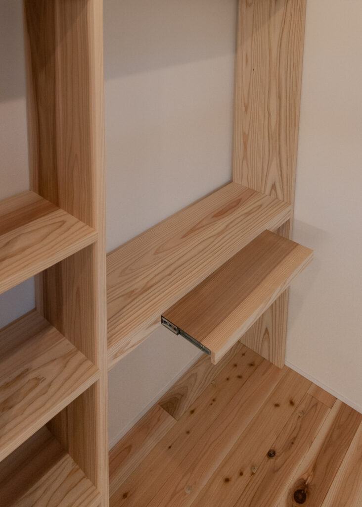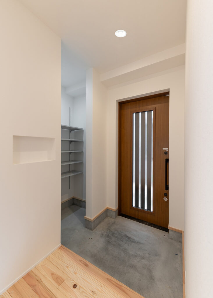 一度目の家づくりで得た知見を生かし、本当に必要なものだけを見極めた収納計画が随所に息づいています。シューズクローク、パントリー、ウォークインクローゼットといった各エリアに、使用頻度や物の性質に応じた収納を配置しました。省令準耐火建物としての安全性も確保しながら、造作家具が機能美を添え、21坪に豊かさを凝縮しています。