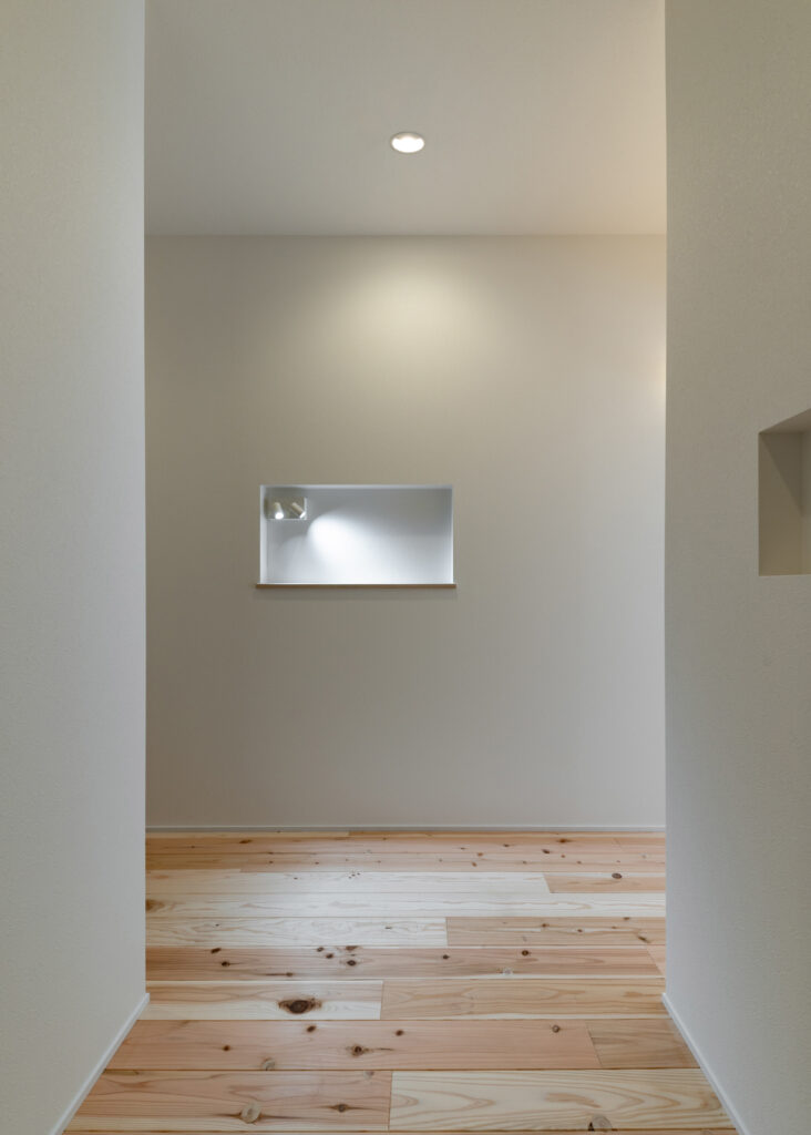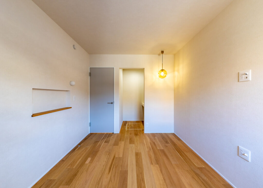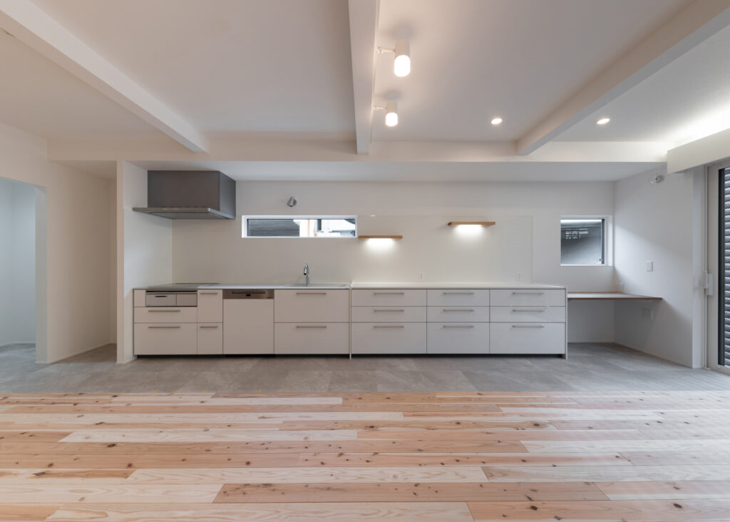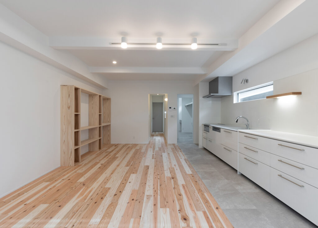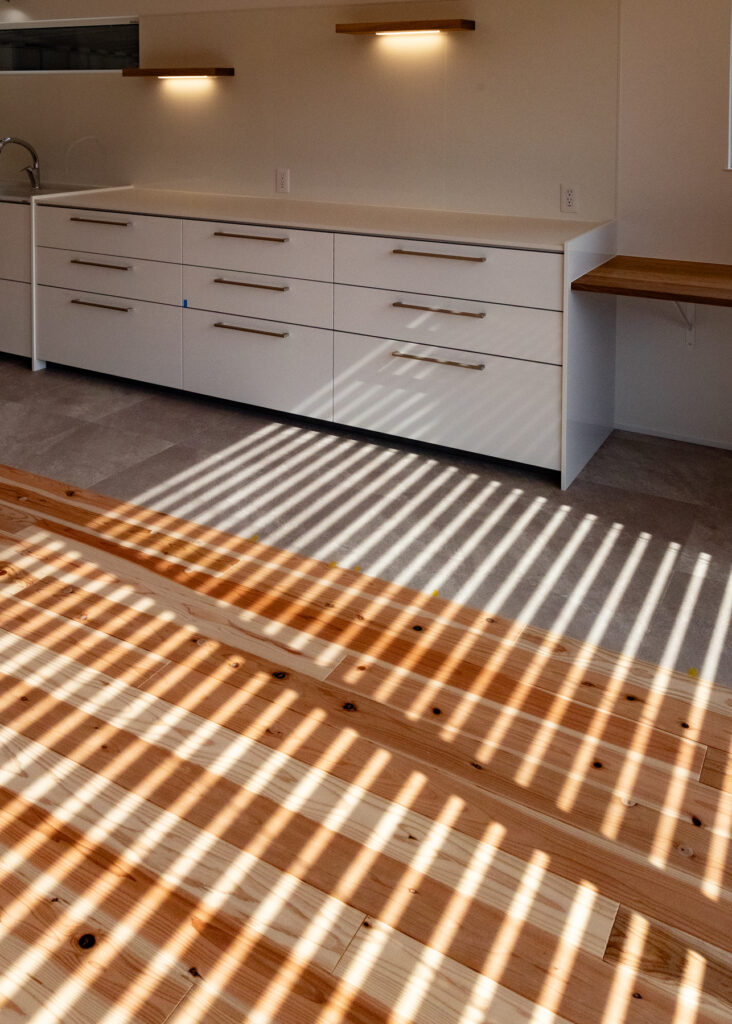 以前の住まいで経験した結露やカビ、温熱環境への不満をもとに辿り着いたのは性能を徹底的に追求した平屋でした。耐震等級3、断熱等級6、UA値0.46、C値0.05という数値が、安心と快適を両立させる確かな技術力を物語っています。外壁には焼杉板、床には無垢のスギ材を採用し、時とともに深まる風合いを楽しめます。