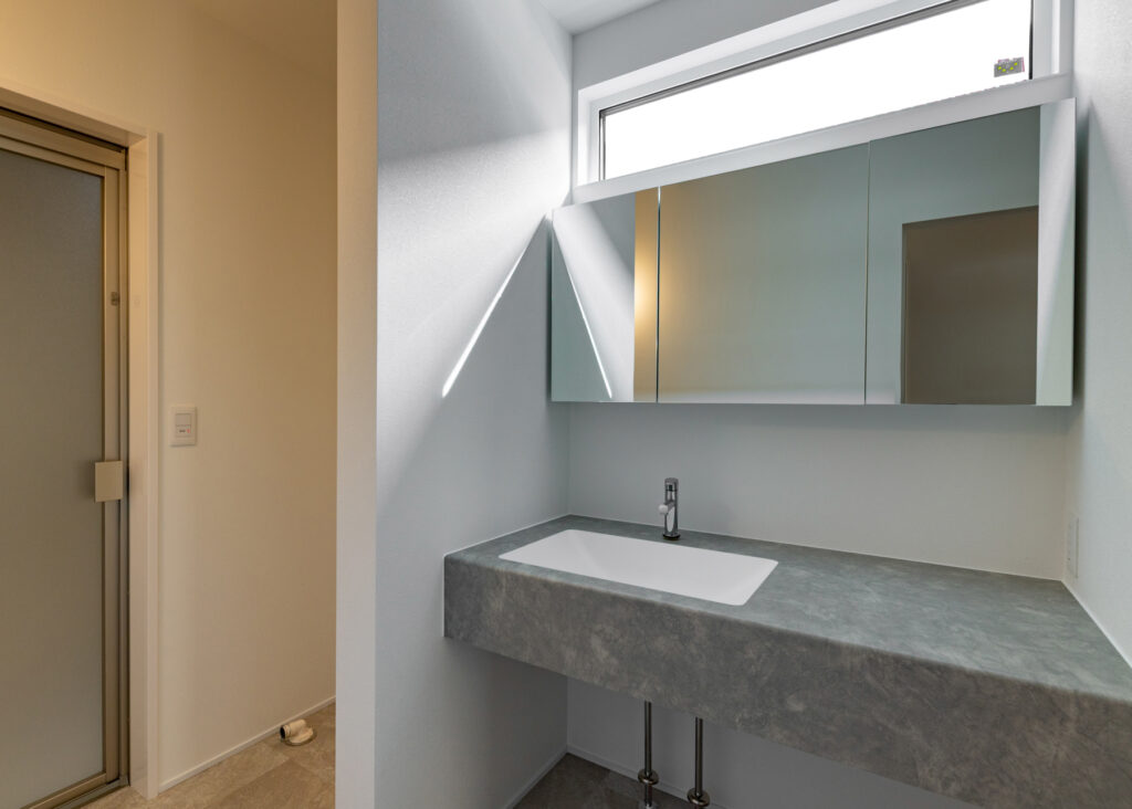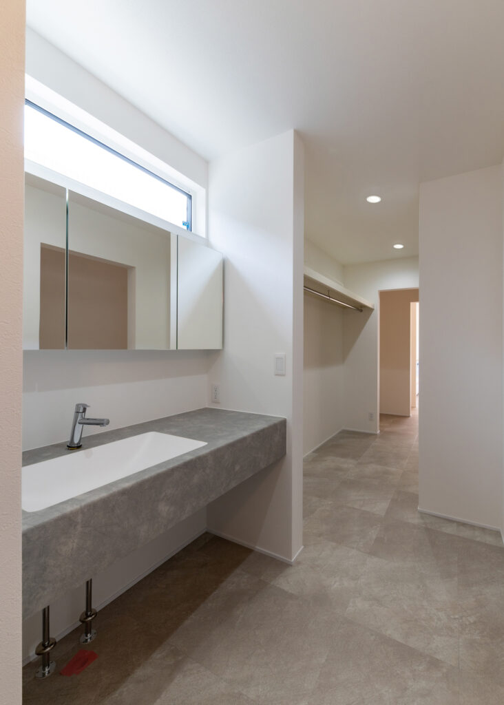 キッチンから洗面脱衣室、パントリーへと続く動線を一本に集約したプランニングが、毎日の家事時間を大幅に短縮します。20帖のLDKを中心に、必要な機能を過不足なく配置した間取りは、二度目だからこそ到達できた境地です。南面には高性能ペアガラス樹脂窓、その他の面にはトリプルガラス樹脂窓を配し、熱損失を最小限に抑えました。