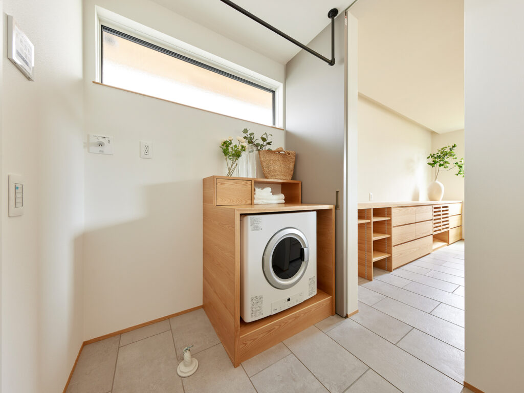 18帖のLDKは、窓から差し込む光で満たされています。洗面スペースとも緩やかにつながり、家事をしながらでも家族の気配を感じられる設計です。キッチンからダイニング、そして洗面へと視線が抜けることで、実際の広さ以上の開放感が生まれます。回遊できる間取りは、忙しい朝の時間も家族がぶつからず、スムーズに支度ができる工夫が詰まっています。