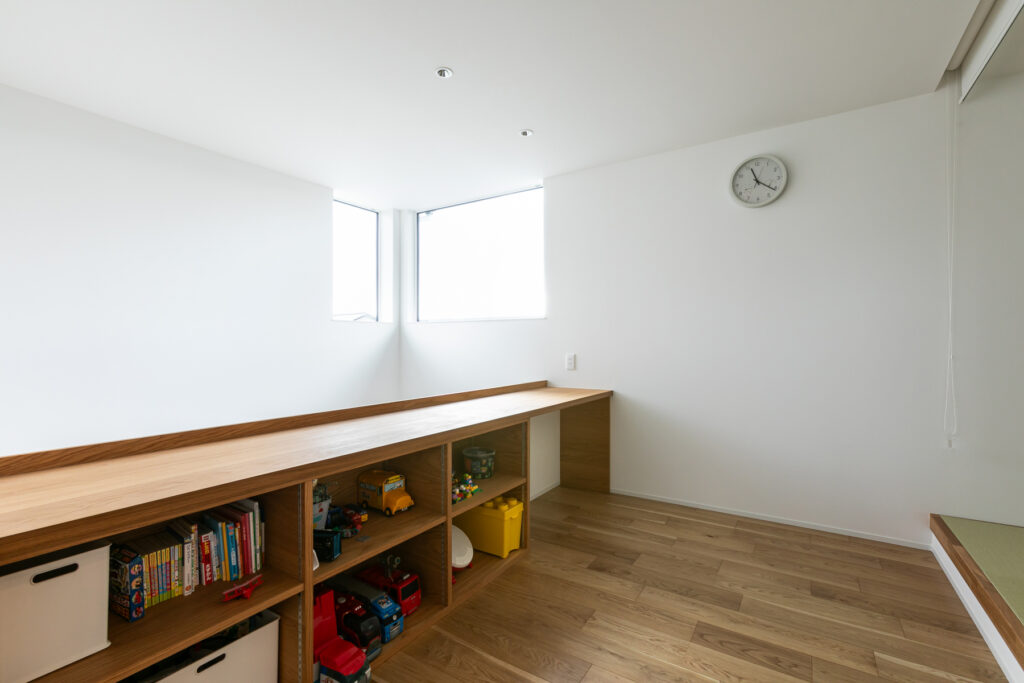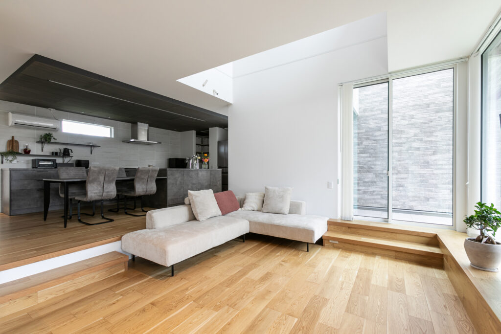 南から明るい光が差し込むリビングは、家族が自然と集まる場所です。隣接する小上がり和室は、憩いの場として多用途に使えます。来客時には客間としても活用できます。