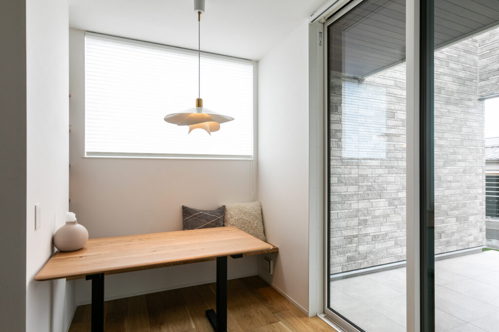 田園の緑が窓の向こうに広がる環境で、新しい暮らしを始めたご家族。家の中心には中庭を望むヌックがあり、そこで過ごすひとときが心を癒やしてくれます。ランドリールームや小上がり和室など、日常を快適にする工夫が随所に詰まっています。