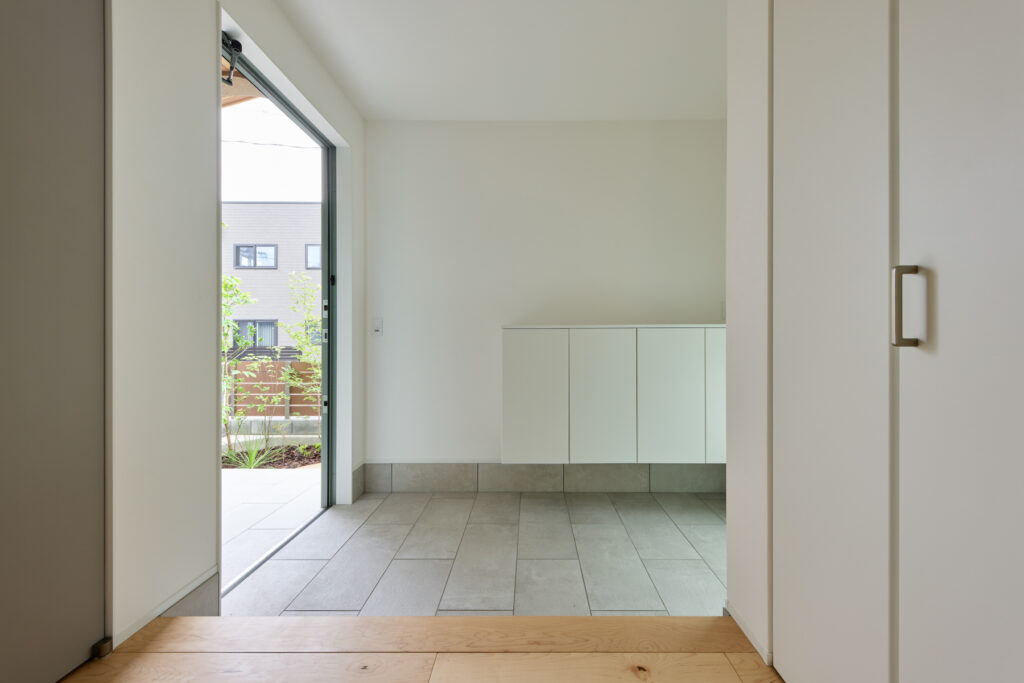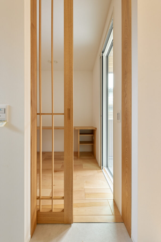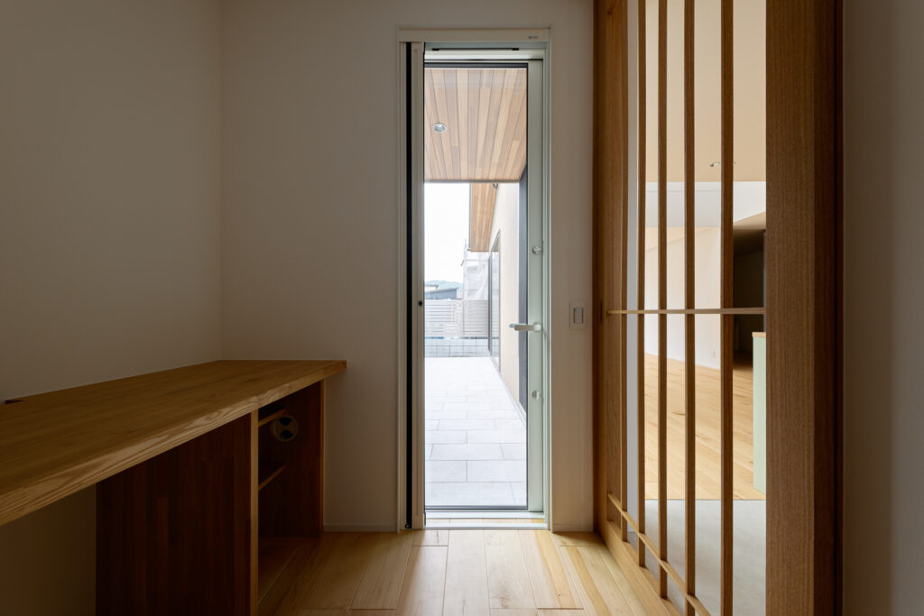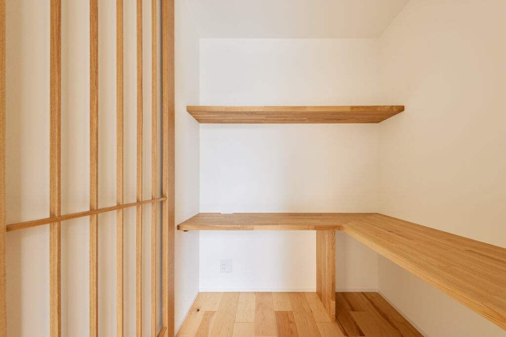 仕事や趣味に集中したいとき、家族の様子も感じていたいとき。その両方をかなえる場所が、リビングに隣接した書斎です。透け感のある仕切りが、音や気配を程よく伝えながらも、自分だけの時間を守ります。カウンターに向かいながら、ふとリビングに目をやれば、家族の笑顔が見える。そんな何気ない瞬間が、毎日を豊かに彩ります。