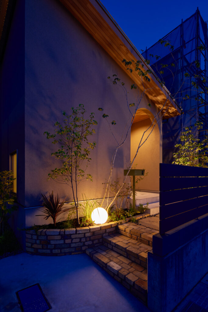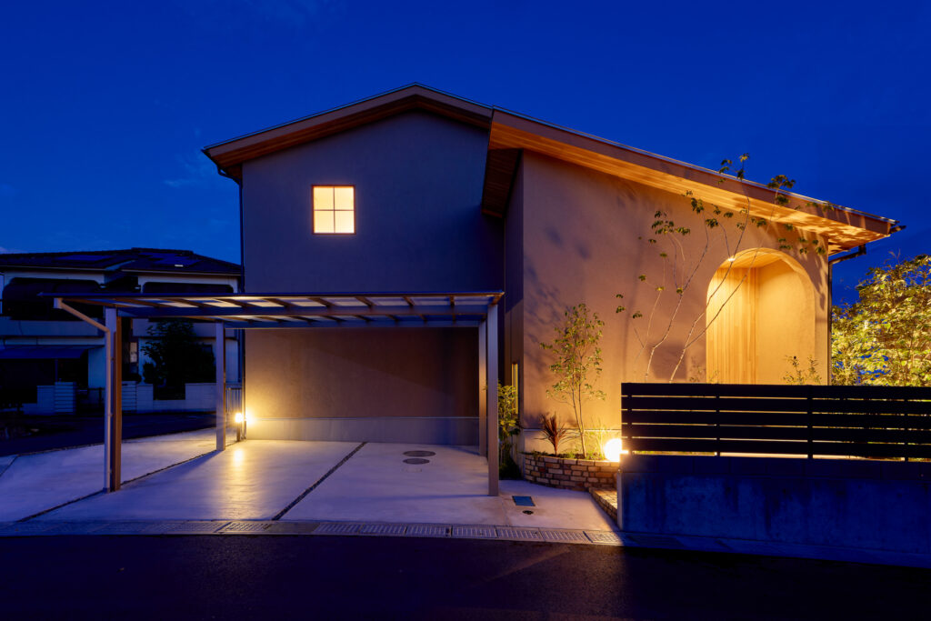 大きな窓から差し込む光が、吹き抜けを通じて室内の隅々まで届きます。昼間は自然の明るさに包まれ、夜になると照明が壁や天井を優しく照らし、落ち着いた雰囲気へと変化します。庭との一体感を感じられる開口部は、外の緑を眺めながら食事をしたり、くつろいだりする時間を特別なものにします。視線が縦にも横にも抜ける構成が、ゆとりある日常を育みます。