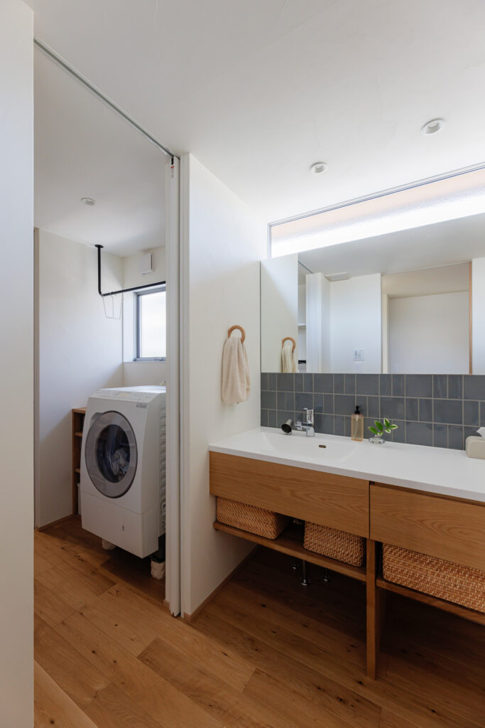 造作の洗面台や手洗いカウンターが空間と調和し、毎日気持ちよく使える、やさしい雰囲気の水回り。
