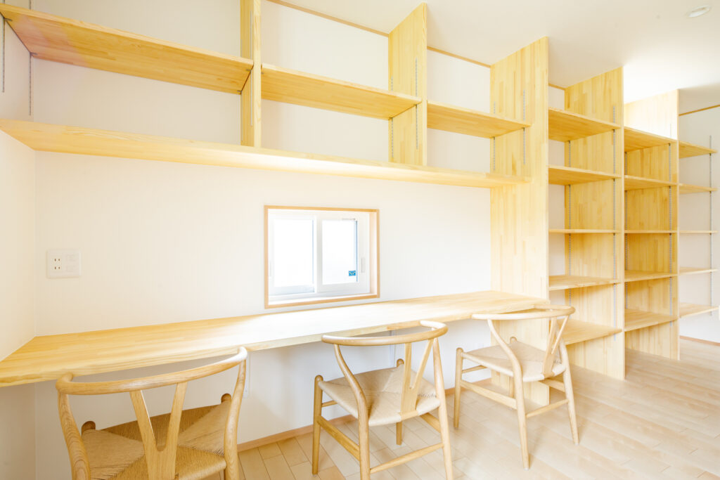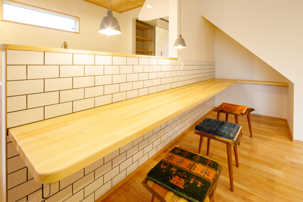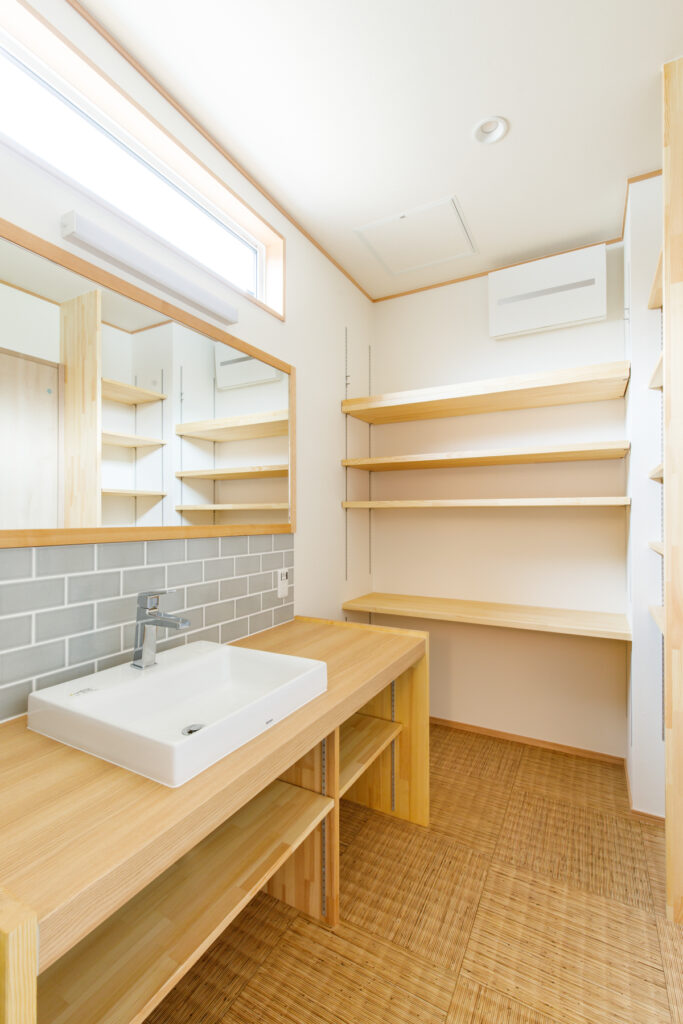 家事動線にもこだわりがいっぱいです。大容量のパントリーや便利な家事コーナーをはじめ、大きい洗面台も魅力的。ライブラリーコーナーがあり、秘密基地になりそうな屋根裏部屋もあります。自分たちで塗ったしっくい壁、こだわりを感じるタイルと照明が暮らしを彩っています。