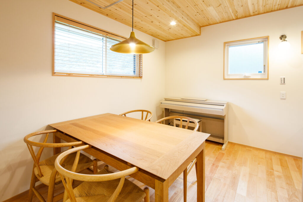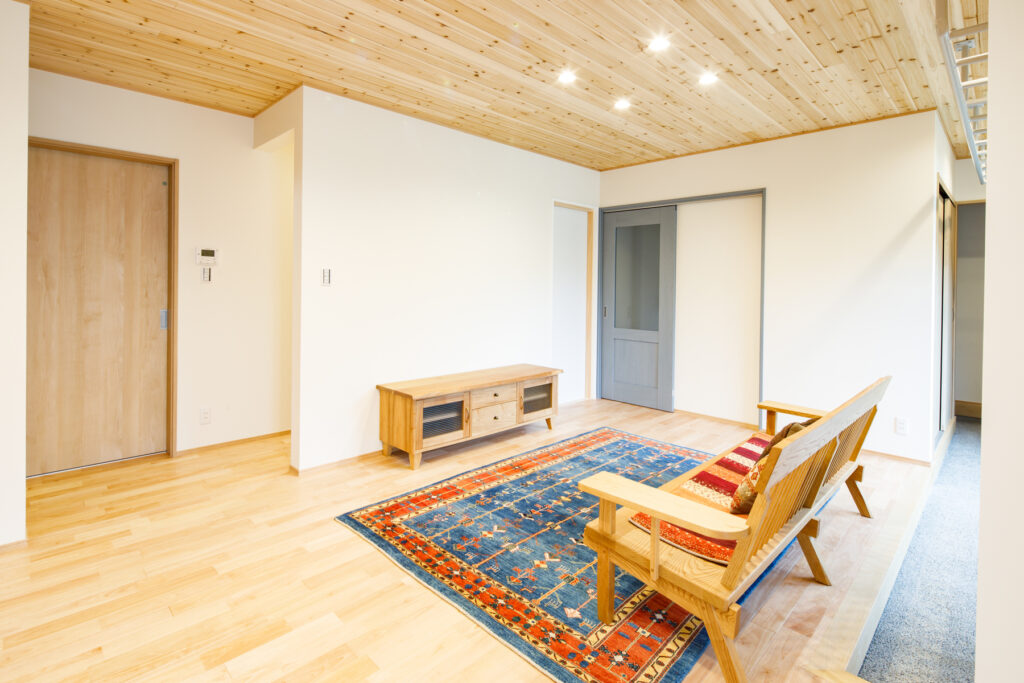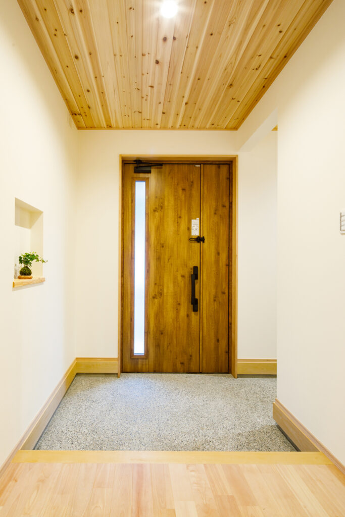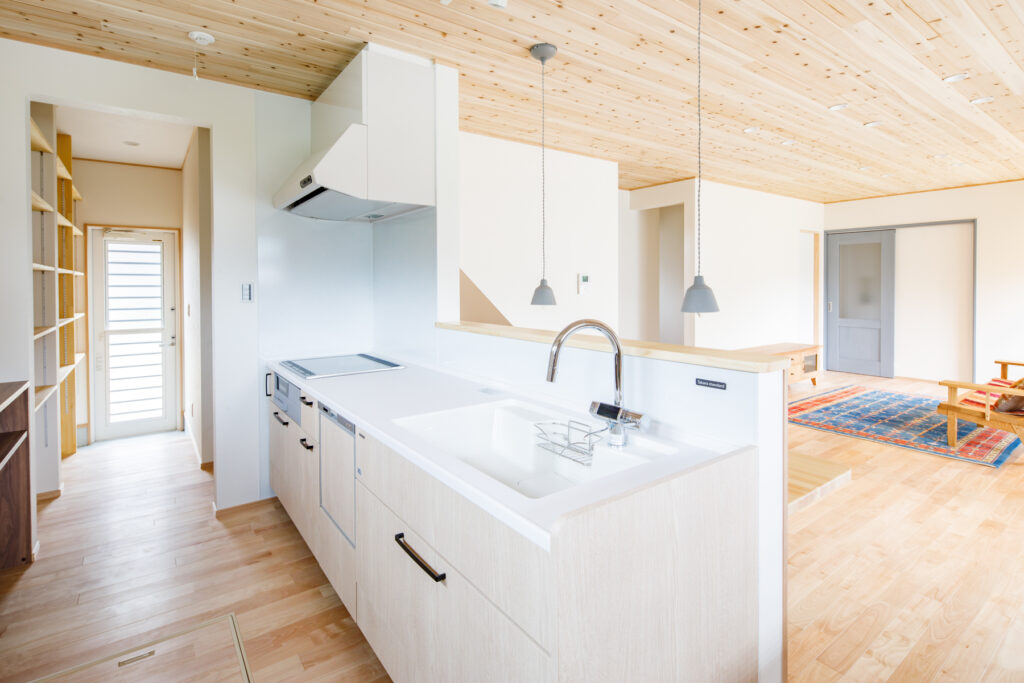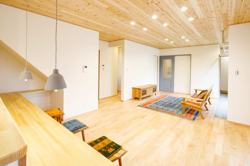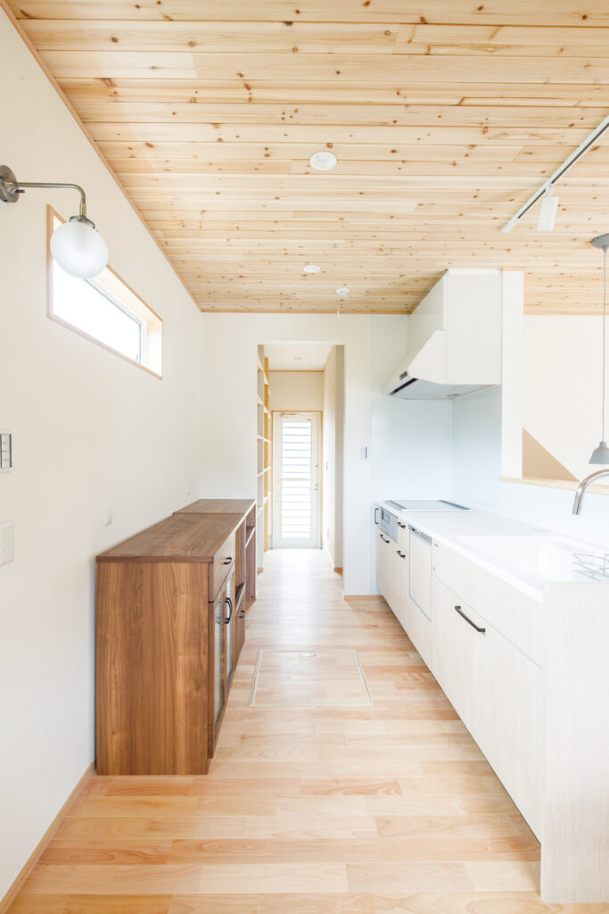 外観は、ダイナミックな大屋根と、黒と白のコントラストが特徴です。本焼杉を使った平屋ベースの住まいが美しく佇んでいます。中へ入れば、通り土間や土間リビングが、趣味の空間や家族のつながりを豊かにしてくれます。「かわいらしいおうち」というNさんの要望通りの空間が出来上がりました。
