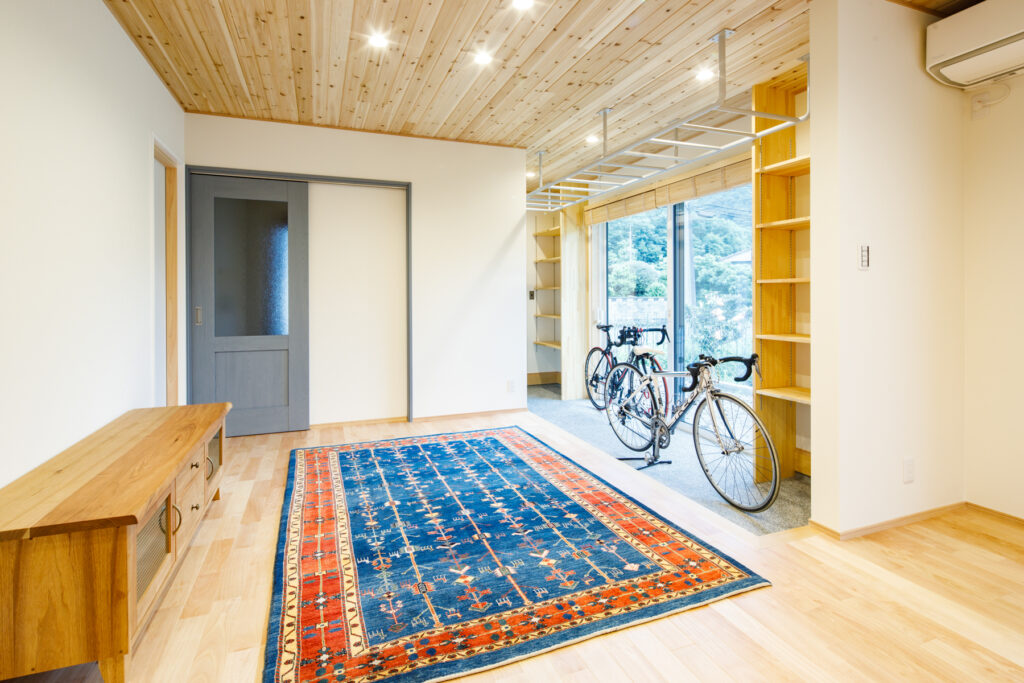 「ロードバイク」と「うんてい」それがNさんの要望でした。実現したのは、家の中にいながらトランポリンや鉄棒もできる、まるでアスレチックのようなワクワクするリビングです。毎日を楽しく過ごしたいというご家族の想いが詰まった、笑顔があふれるおうちです。
