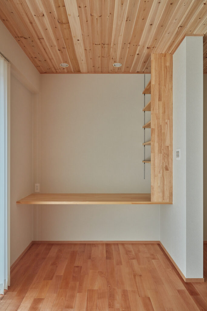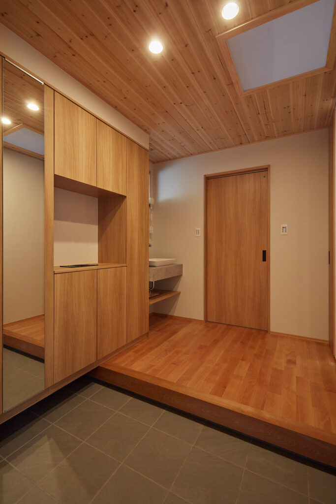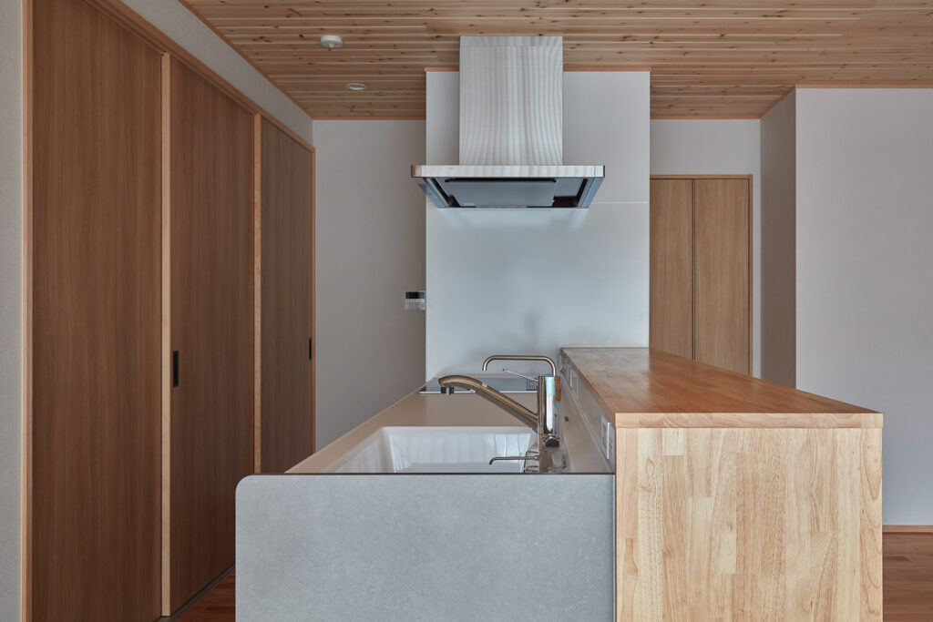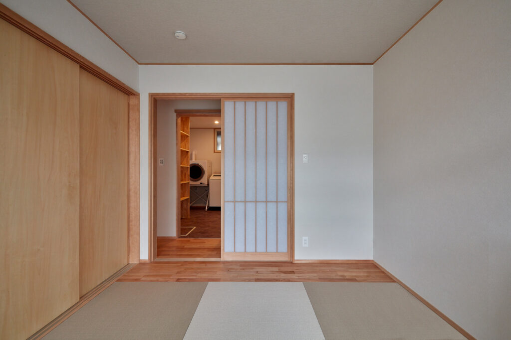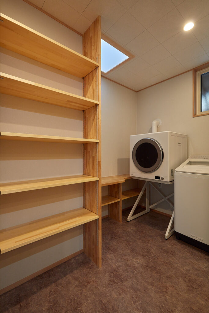 かつての細分化された間取りを刷新し、LDKから寝室や和室、サニタリーへ直接アクセスできる効率的な動線を実現しました。キッチン背面には家電を隠せる大容量パントリー、家事室には奥さまの身長に合わせた造作アイロン台を設置。子育て世帯にうれしい機能美と、家族を見渡せる安心感が共存しています。