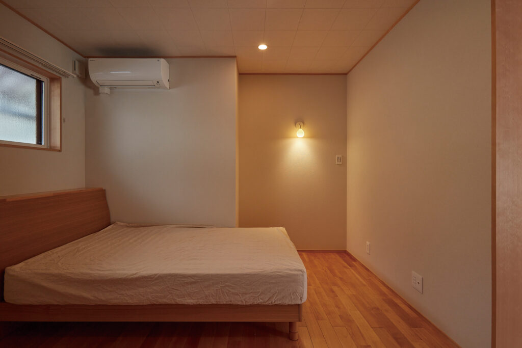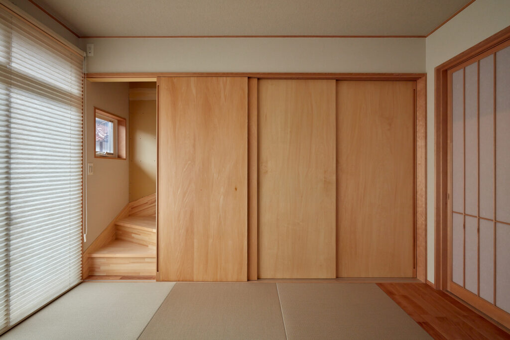 外観には実家の純和風な趣を残しつつ、内装はモダンに一新。二世帯の生活空間を分けるため玄関を新設し、手洗い場を設けるなど衛生面にも配慮しました。客間やお昼寝に重宝する和室の収納奥には、小屋裏物置へ続く階段を配置。プライバシーを確保しながら、既存の良さと新しさが調和する空間に仕上げています。
