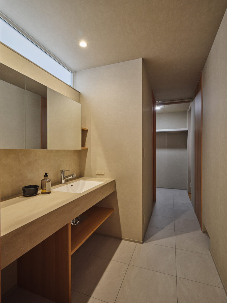 内装も外装もベージュを基調に整えられた空間は、どこかやさしく、訪れる人の心を自然と和ませます。視線を上げると天井が高く伸びやかに広がり、シンプルでありながらあたたかみのある雰囲気が、毎日の暮らしに穏やかな安らぎをもたらしています。